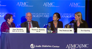 Brenda Schmidt, MS, MBS, moderates a discussion on the diabetes online community and the opportunity for social media in type 1 and type 2 diabetes care. She is joined by panelists Hope Warshaw, MMSc, RD, CDE, BC-ADM; Thomas C. Hawkins, MD, MS; Amy Tenderich, MA, and Kerri Sparling.