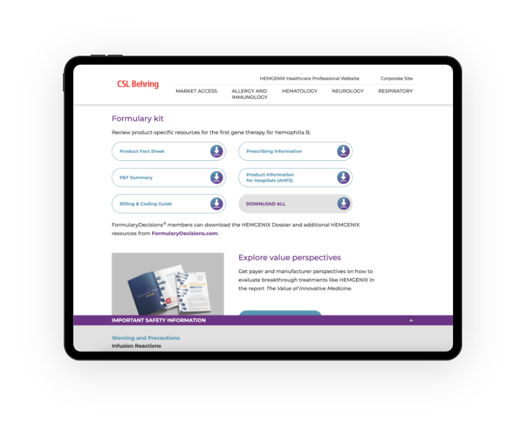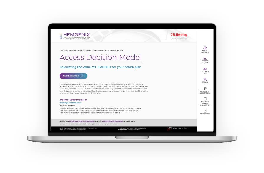 Important Safety InformationWarning and PrecautionsInfusion ReactionsInfusion reactions, including hypersensitivity reactions and anaphylaxis, may occur. Monitor during administration and for at least 3 hours after end of infusion. If symptoms occur, slow or interrupt administration. Re-start administration at a slower infusion once resolved. Hepatotoxicity/Hepatocellular CarcinomaPost-dose, monitor for elevated transaminase levels. Consider corticosteroid treatment should elevations occur. The integration of liver-targeting AAV vector DNA into the genome may carry the theoretical risk of hepatocellular carcinoma development. For patients with preexisting risk factors for hepatocellular carcinogenicity, perform regular (eg, annual) abdominal ultrasound and alpha-fetoprotein testing following administration. Immune-mediated neutralization of the AAV5 vector capsidPreexisting neutralizing anti-AAV antibodies may impede transgene expression at desired levels. Monitoring Laboratory TestsIn addition to monitoring liver function, monitor for Factor IX activity and Factor IX inhibitors after administration. Adverse ReactionsThe most common adverse reactions (incidence ≥5%) were elevated ALT, headache, blood creatine kinase elevations, flu-like symptoms, infusion-related reactions, fatigue, nausea, malaise, and elevated AST. IndicationHEMGENIX is an adeno-associated virus vector-based gene therapy indicated for the treatment of adults with Hemophilia B (congenital Factor IX deficiency) who: - Currently use Factor IX prophylaxis therapy, or
