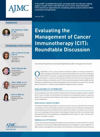 In this AJMC® roundtable discussion, oncology health care decision-making experts consider factors that affect the use of cancer immunotherapies (CITs) and discuss approaches for actualizing policies and procedures within community oncology teams.