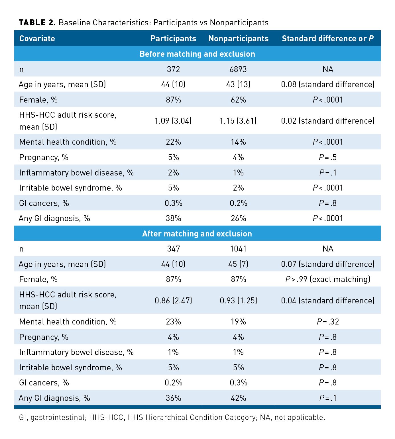 We propensity score matched participants and nonparticipants within the same public school system based on age, self-reported gender, preprogram total health care costs broken out by claim category (ie, inpatient, emergency department [ED], other hospital, and outpatient nonfacility and pharmacy), preprogram GI-specific medical costs (to help address differences in GI conditions with different care needs such as functional conditions and cancer), postprogram HHS Hierarchical Condition Category (HHS-HCC) scores (the risk adjustment model used by HHS for the individual and small group markets in response to the Affordable Care Act, which matches on the basis of age, sex, acute and chronic conditions, and combinations of comorbid conditions based on the preceding year’s diagnosis codes),16 and a postprogram GI condition flag (whether the person had a diagnosed GI condition or not).