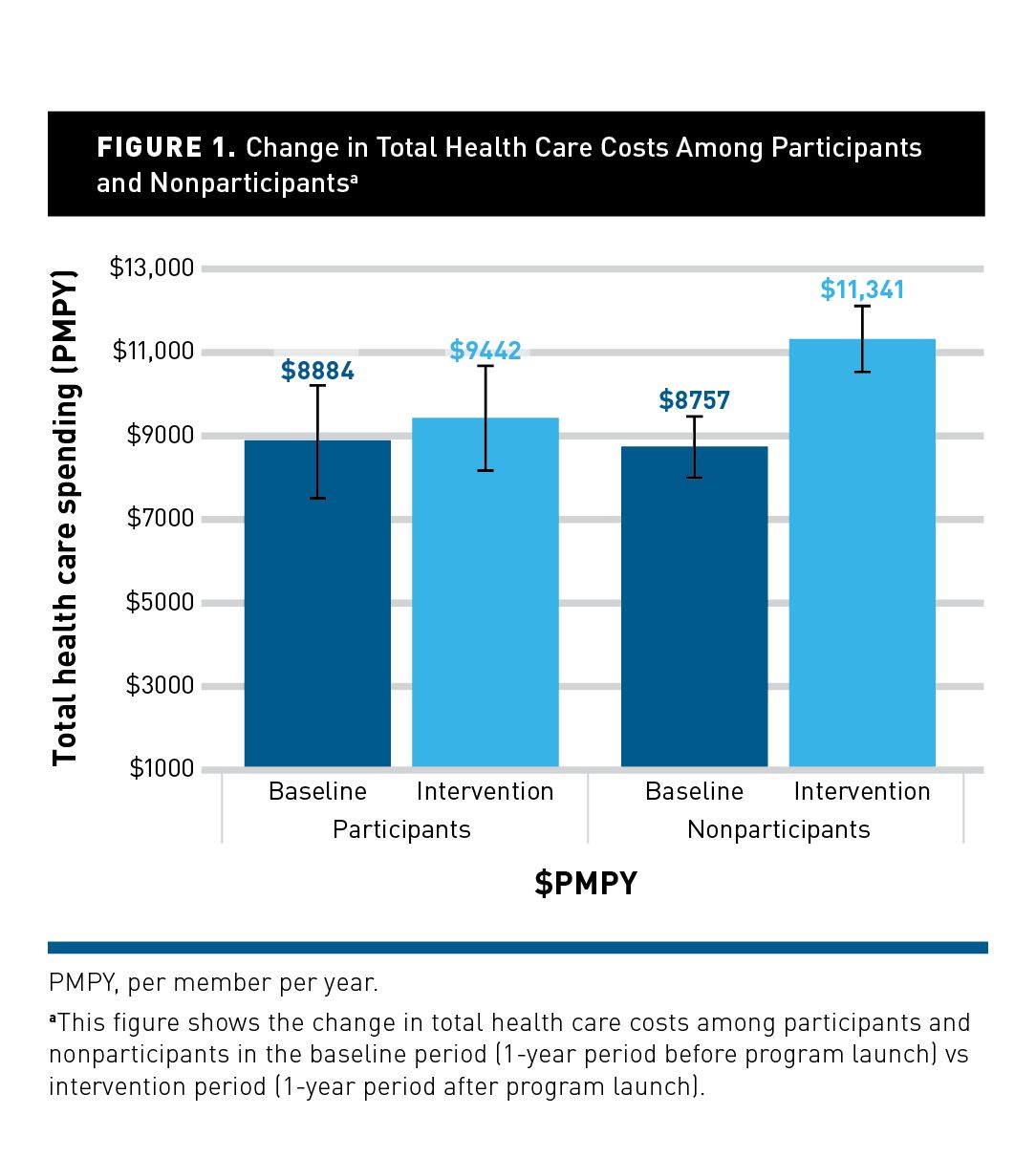 Overall, although total health care costs increased for both participants and nonparticipants from the baseline period to the intervention period (
