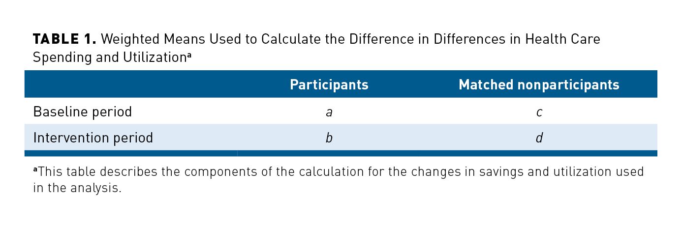 We utilized a retrospective cohort study design deploying 3:1 propensity score matching and difference-in-differences (DID) methodology to quantify the change in total health care costs from the baseline period to the intervention period for participants vs nonparticipants. We used a generalized linear model to test the significance of the DID.