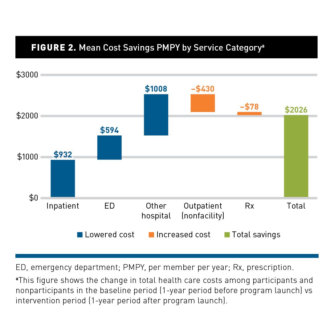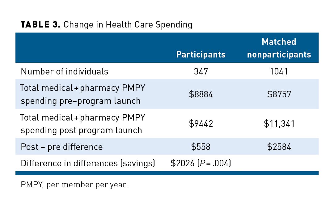 Second, the observed savings were largely driven by decreased utilization and spending for inpatient admissions and emergency care. This decrease in health care utilization and associated savings was observed much earlier (in the first year after implementation of the intervention) compared with other employer-sponsored interventions.8 This may have been a result of engaging participants earlier in the care journey and preventing clinical deterioration while shifting care to less expensive outpatient venues.
