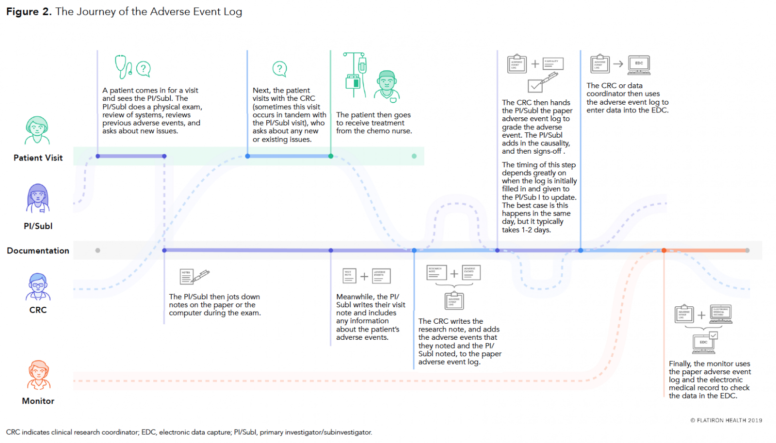 Additionally, AEs must be reviewed at every patient interaction (each visit, phone call, etc). This results in a risk that the CRC is interacting with the patient at the same time the PI/SubI is reviewing the log. Therefore, the CRC may not have the log on hand to immediately document the AE reported by the patient. Based on many conversations between Flatiron Health staff and those in clinical practices, it is clear that this cumbersome, multistep process means that the log may be in the wrong place at the wrong time.