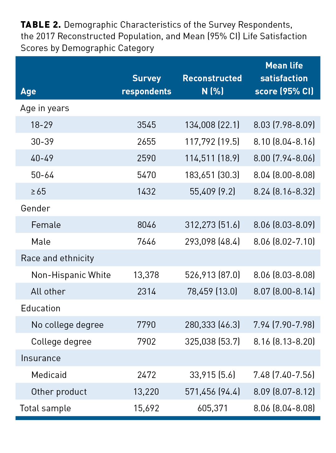 A total of 83% of the survey respondents answered the life satisfaction question and all 6 health-related behavior questions. In addition to listing the number of survey respondents by demographic category, Table 2 displays the attributes of the 2017 member population reconstructed to represent these survey respondents. It also lists the mean life satisfaction score and 95% CI for each of the demographic categories. The 50-to-64-year age group is the largest of the 5, and only 9.2% of the members are 65 years and older. The remaining members are distributed relatively evenly over the 18-to-49-year age range. Although there are only slightly more women than men, the members are predominantly non-Hispanic White. Nearly half have a college degree. Slightly more than 5% are insured through Medicaid.