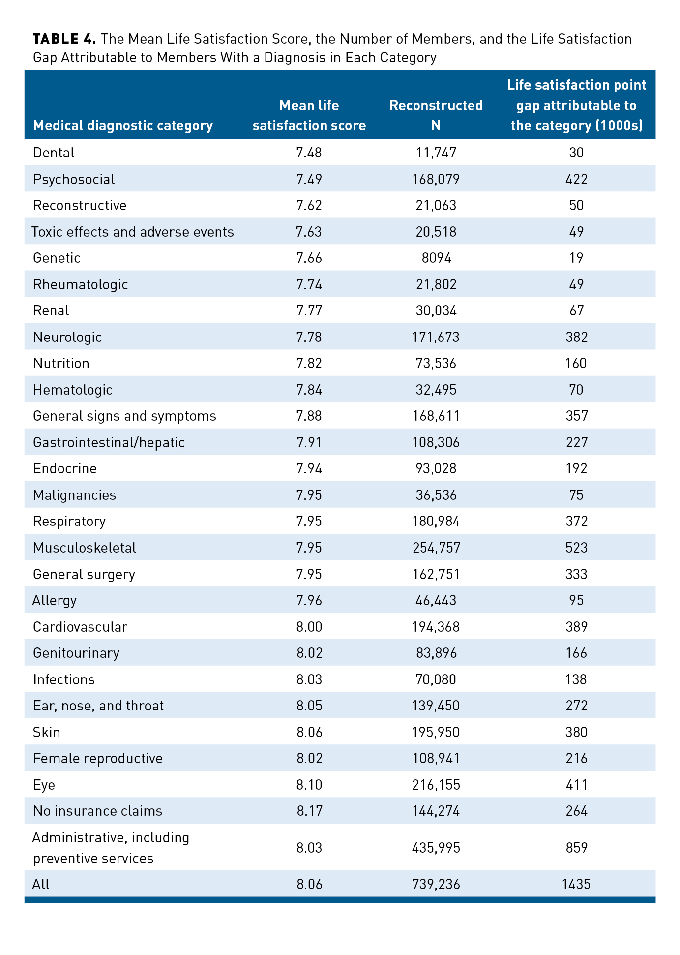 Members with a dental claim have, on average, the lowest level of life satisfaction (7.48), but because the group is small (11,747), the life satisfaction gap is also small (30,000 points) (