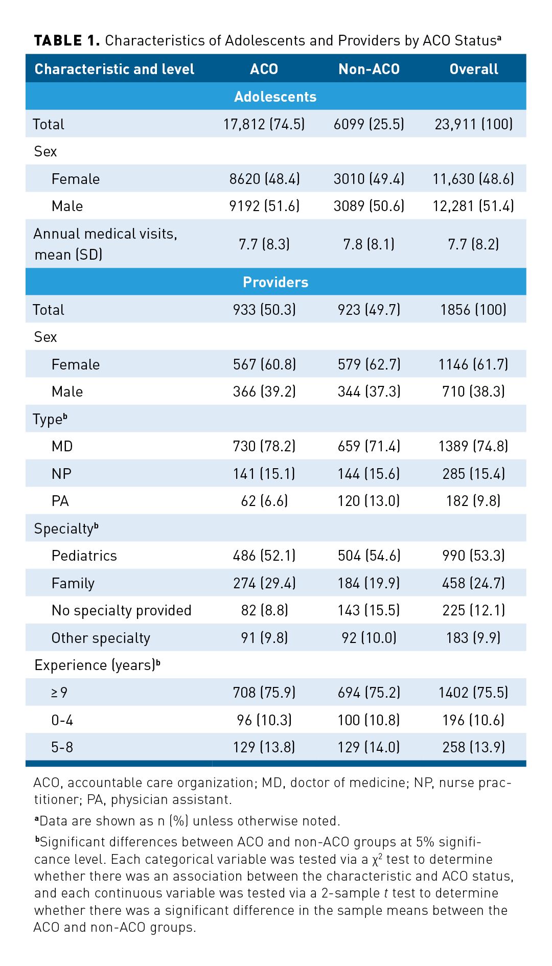 We performed a 2-step attribution process to match adolescents to their respective primary care provider and then to match primary care providers to their respective ACO. Among adolescents who received an HPV vaccine, we designated the provider who administered the initial HPV vaccine as the adolescent’s primary care provider. Among adolescents who did not receive an HPV vaccine, the provider visited the most by these adolescents at age 14 years was designated as the adolescent’s primary care provider. ACOs provided lists of their affiliated providers, and we aggregated patients to providers using NPIs. Providers not associated with an ACO were deemed non–ACO-attributable providers and grouped together in the analysis. We categorized the profession (physicians, advanced practice registered nurses, physician assistants) and specialty (family medicine, internal medicine, pediatrics, general practice, or obstetrics-gynecology) of providers using the NPI. Our primary outcomes of interest were HPV vaccine initiation (yes/no) and HPV vaccine completion (yes/no). We used the most recent ACIP HPV vaccination recommendations to operationalize study outcomes.13 Recipients of at least 1 dose were considered to have initiated the series. Recipients of at least 2 doses of HPV vaccination were considered to have completed the series.