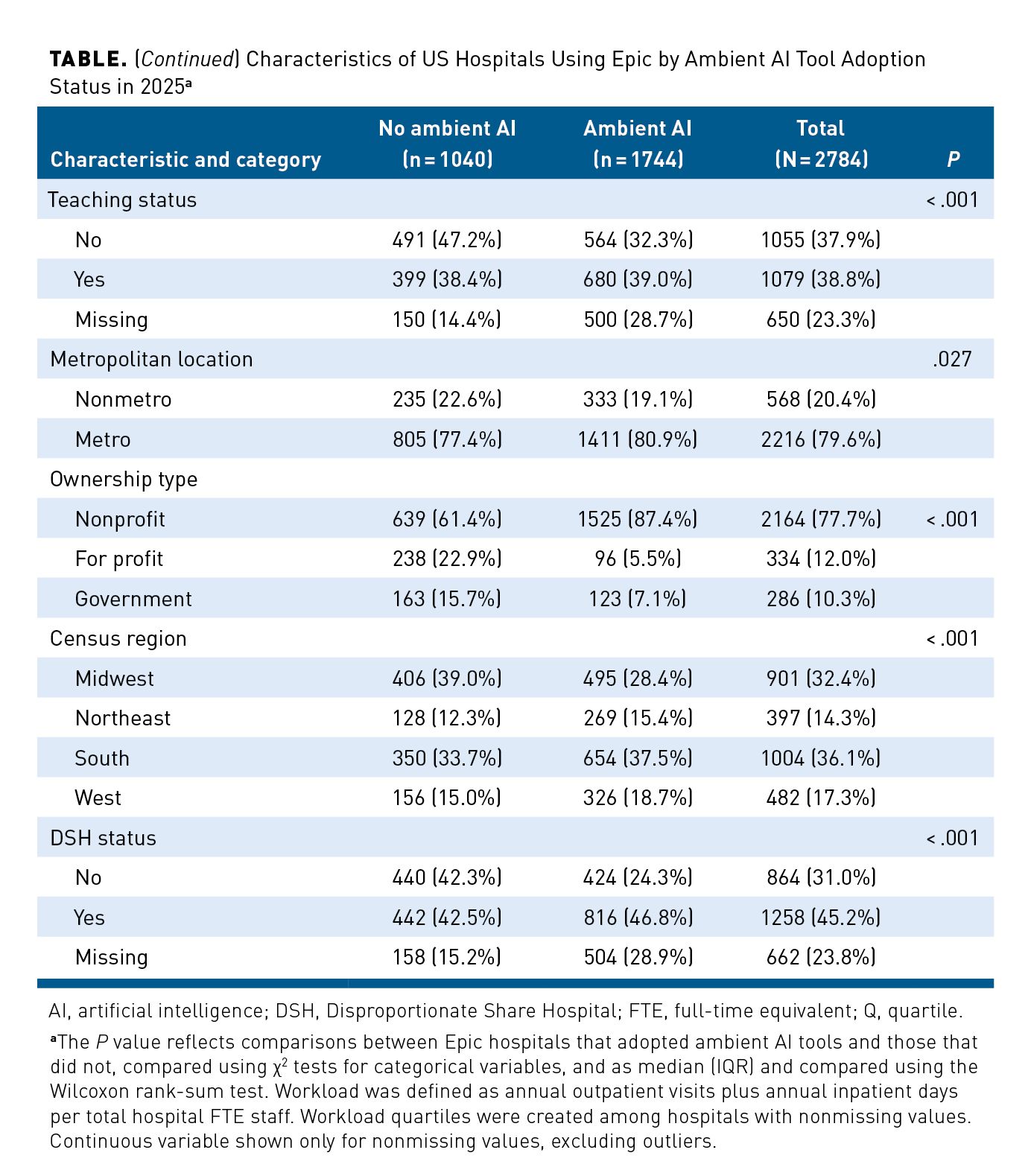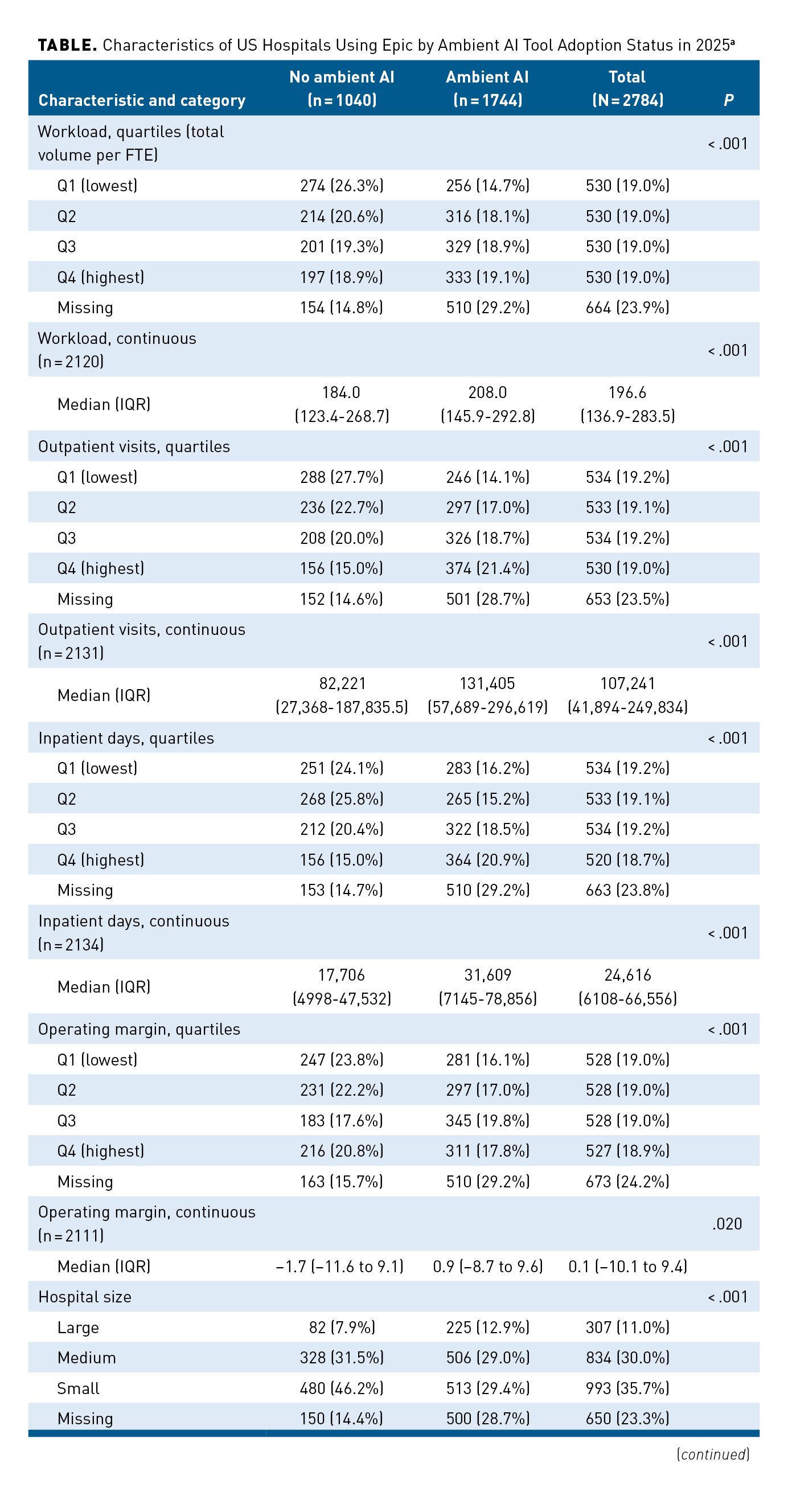 Results: Among 6561 US hospitals, 2784 (42.4%) were Epic users. Among Epic hospitals, 62.6% adopted ambient AI. In adjusted analyses, adoption was higher across workload quartiles (61.7% in quartile [Q] 1 vs 73.1% in Q4; P = .003) and among hospitals in the top operating margin quartiles (58.0% in Q1 vs 67.6% in Q4; P = .001 vs Q1). Adoption was higher among metropolitan hospitals (64.7% vs 54.3% in nonmetropolitan hospitals; P = .012) and nonprofit hospitals (70.2% vs 28.8% in for-profit hospitals; P < .001).
