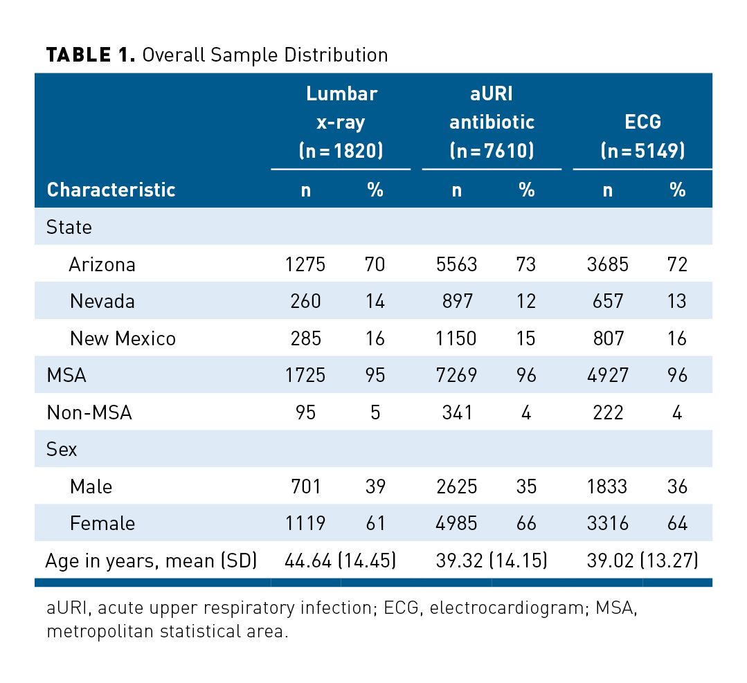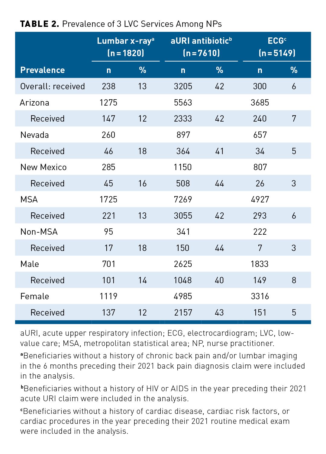 Methods: Data for 14,579 adult beneficiaries in the 2021 Merative MarketScan Commercial and Medicare databases in Arizona, Nevada, and New Mexico were analyzed. Outpatient claims associated with NP care were used to examine the use of low-value lumbar x-ray, antibiotics for acute upper respiratory infection (aURI), and routine electrocardiogram (ECG) as described by the Choosing Wisely initiative. International Statistical Classification of Diseases, Tenth Revision and Current Procedural Terminology codes were used to apply inclusion and exclusion criteria. Relationships between LVC use and the state where a beneficiary received care, rural-urban practice location, and beneficiary sex and age were examined.