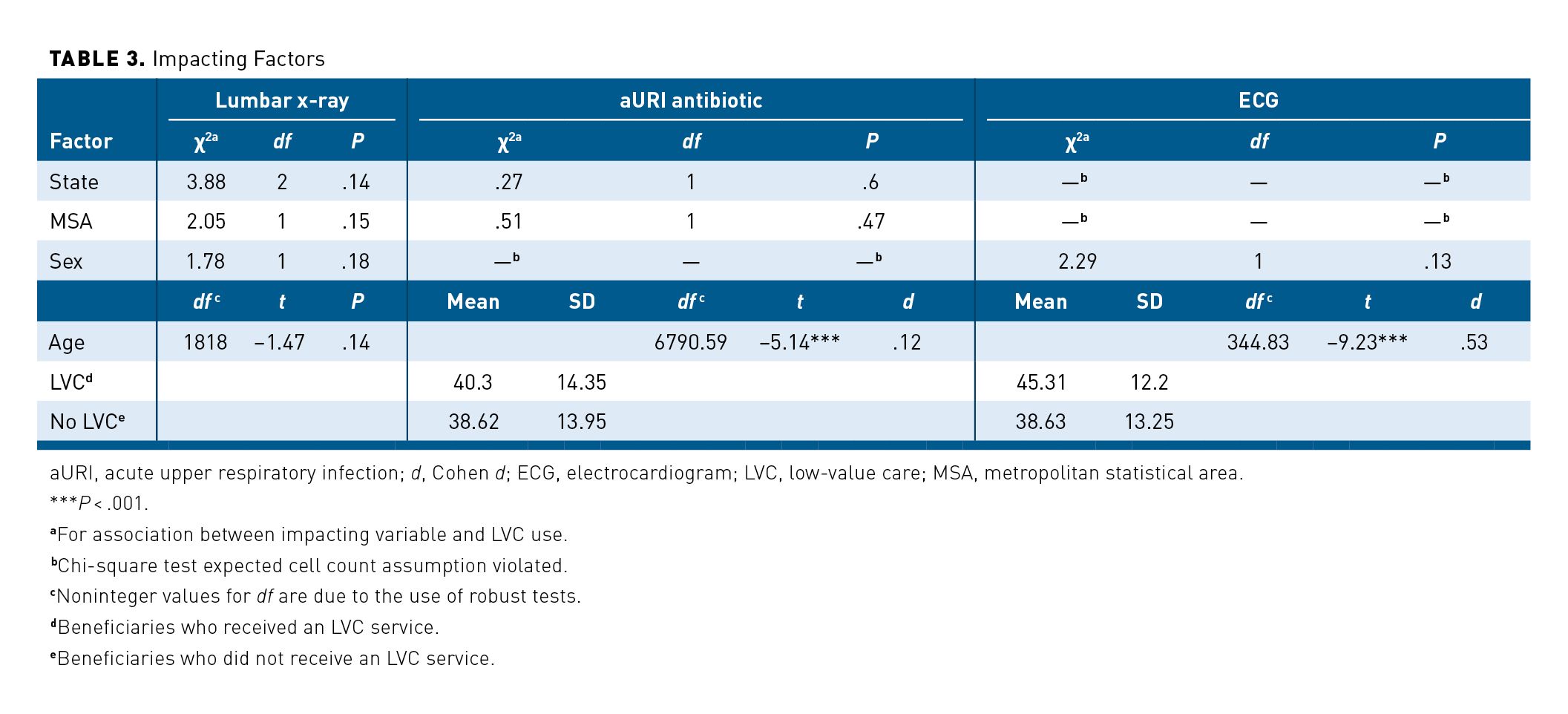 Results: Prevalence rates of NP use of low-value lumbar x-ray (13%), aURI antibiotic (42%), and ECG (6%) were lower or relatively similar to those found in other studies. Older beneficiary age was significantly associated with more low-value ECGs used (P < .001), but when adults 45 years and older were examined, age no longer remained significantly related. No significant relationships between NP LVC use and practice location or beneficiary sex were found.