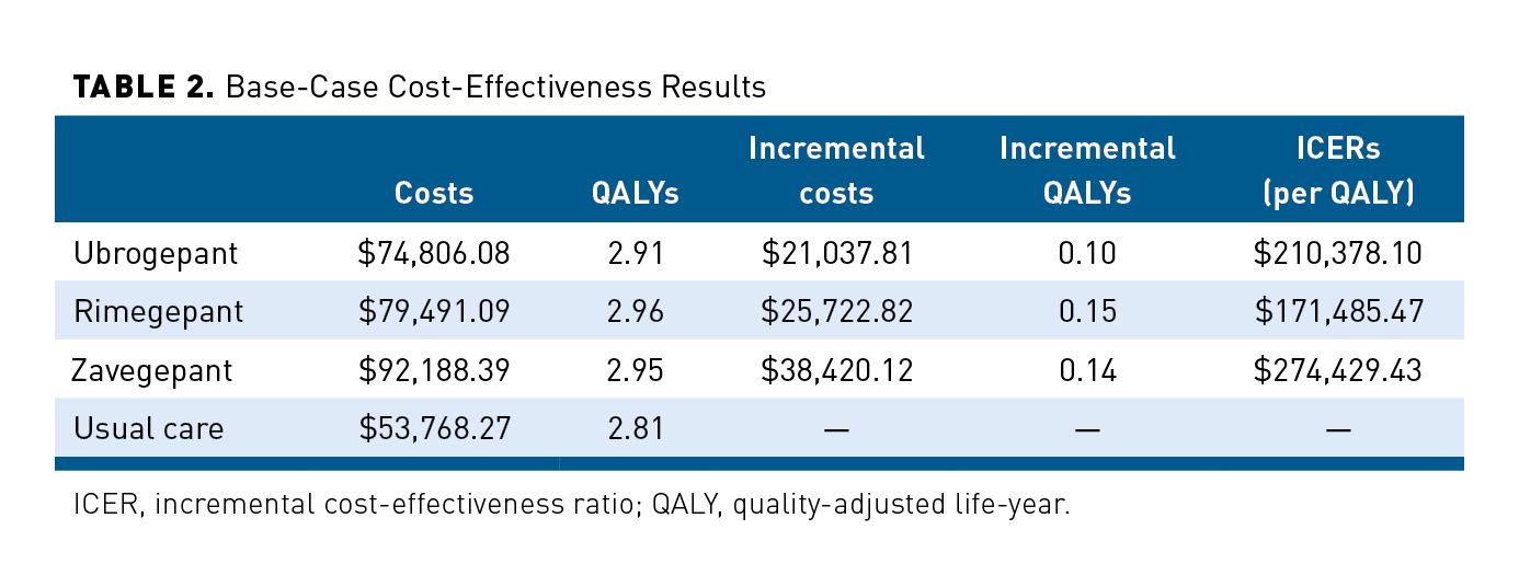 In the base-case analysis, the annual costs were as follows: $74,806.08 for ubrogepant, $79,491.09 for rimegepant, $92,188.39 for zavegepant, and $53,768.27 for usual care. The QALYs for ubrogepant, rimegepant, zavegepant, and usual care were 2.91, 2.96, 2.95, and 2.81, respectively. All 3 gepants were not cost-effective compared with usual care under willingness-to-pay (WTP) thresholds of $50,000 per QALY, $100,000 per QALY, and $150,000 per QALY, with ICERs of $210,378.10 per QALY for ubrogepant, $171,485.47 per QALY for rimegepant, and $274,429.43 per QALY for zavegepant.