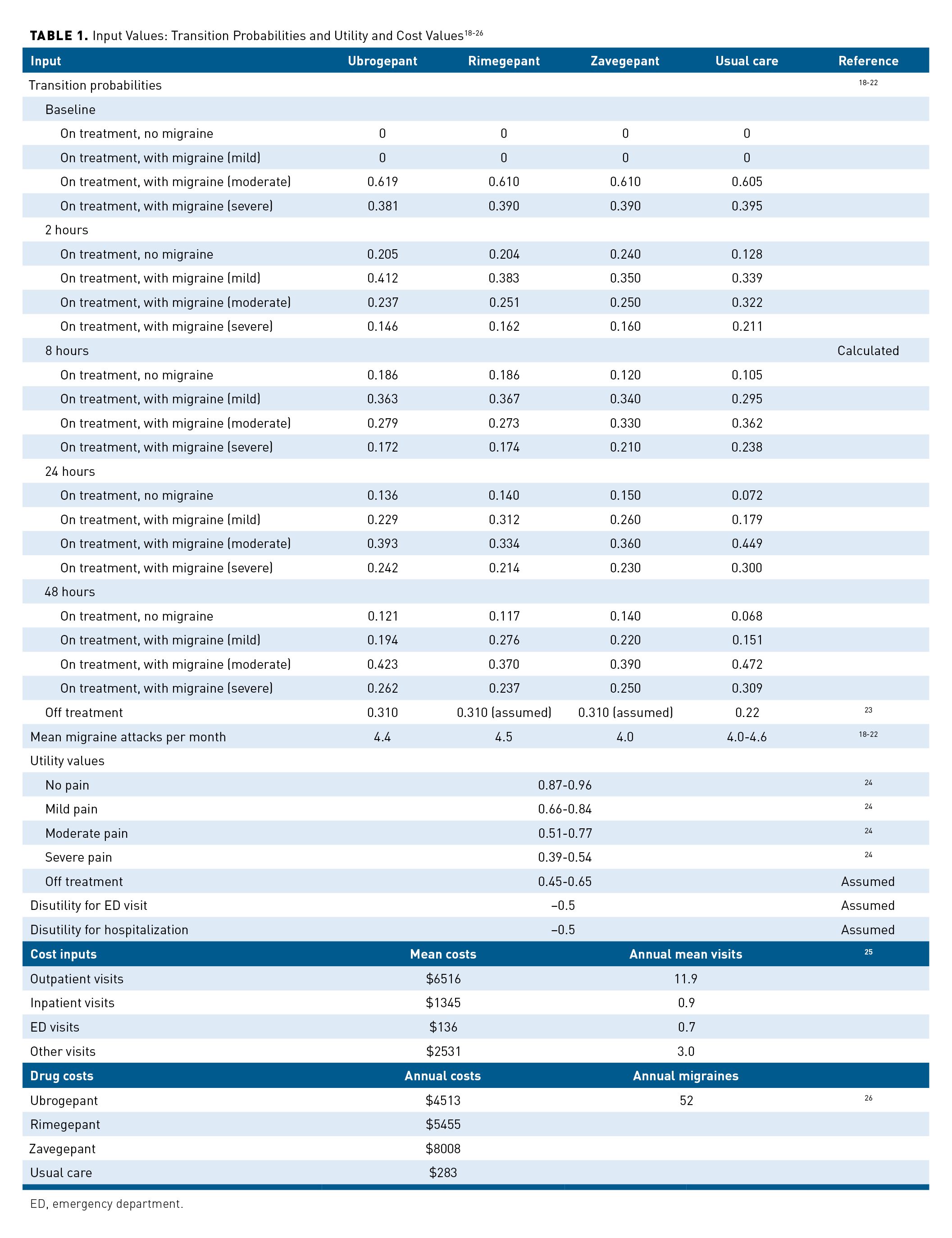 Shao et al25 reported costs associated with chronic migraine, episodic migraine, and tension-type headaches. Chronic migraines are characterized by 15 or more days of headache per month, and episodic migraines are characterized by fewer than 15 days of headache per month.25 We considered the costs for episodic migraine, aligning with the fewer than 15 migraine days evaluated in our model. We considered these costs to be the same for all the gepants due to the similar clinical profile and indications. An inflation rate of 3.5% was used to calculate 2024 costs. The annual costs were adjusted to per-cycle costs in the model and were discounted at 3% annually. Cost inputs are provided in Table 1.