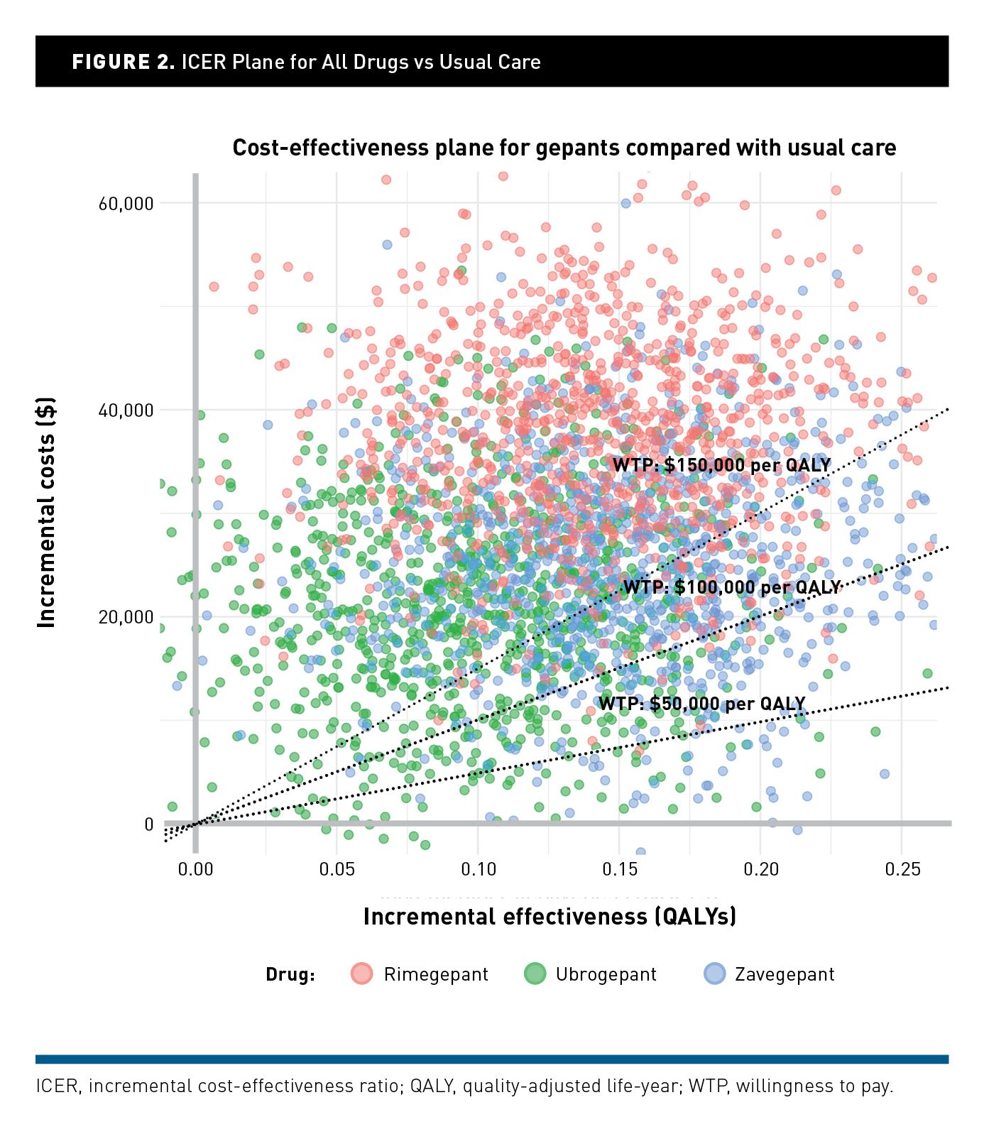 This analysis found that none of the 3 gepants were cost-effective compared with usual care at a WTP threshold of $150,000 per QALY. Rimegepant had the lowest ICER ($171,485.47 per QALY), followed by ubrogepant ($210,378.10 per QALY) and zavegepant ($274,429.43 per QALY).
