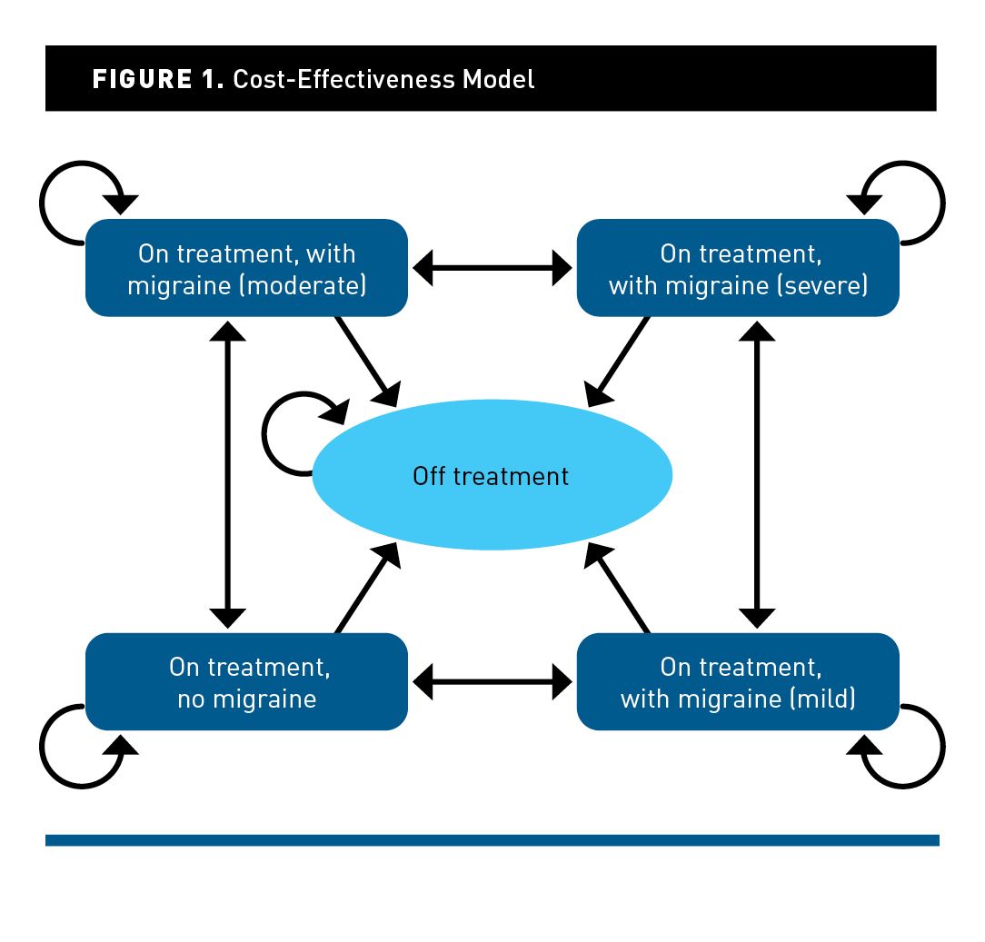Our model was constructed from the US payer’s perspective, following the methodology of Atlas et al, which developed a Markov model with 4 health states that was informed by a network meta-analysis of key clinical trials, previous economic models, systematic literature reviews, and input from diverse stakeholders, including patients, advocacy groups, clinicians, payers, researchers, and manufacturers.14 The Atlas et al model represents the only comprehensive cost-effectiveness analysis of gepants from a US payer perspective available in the literature, and it served as the basis for our model.