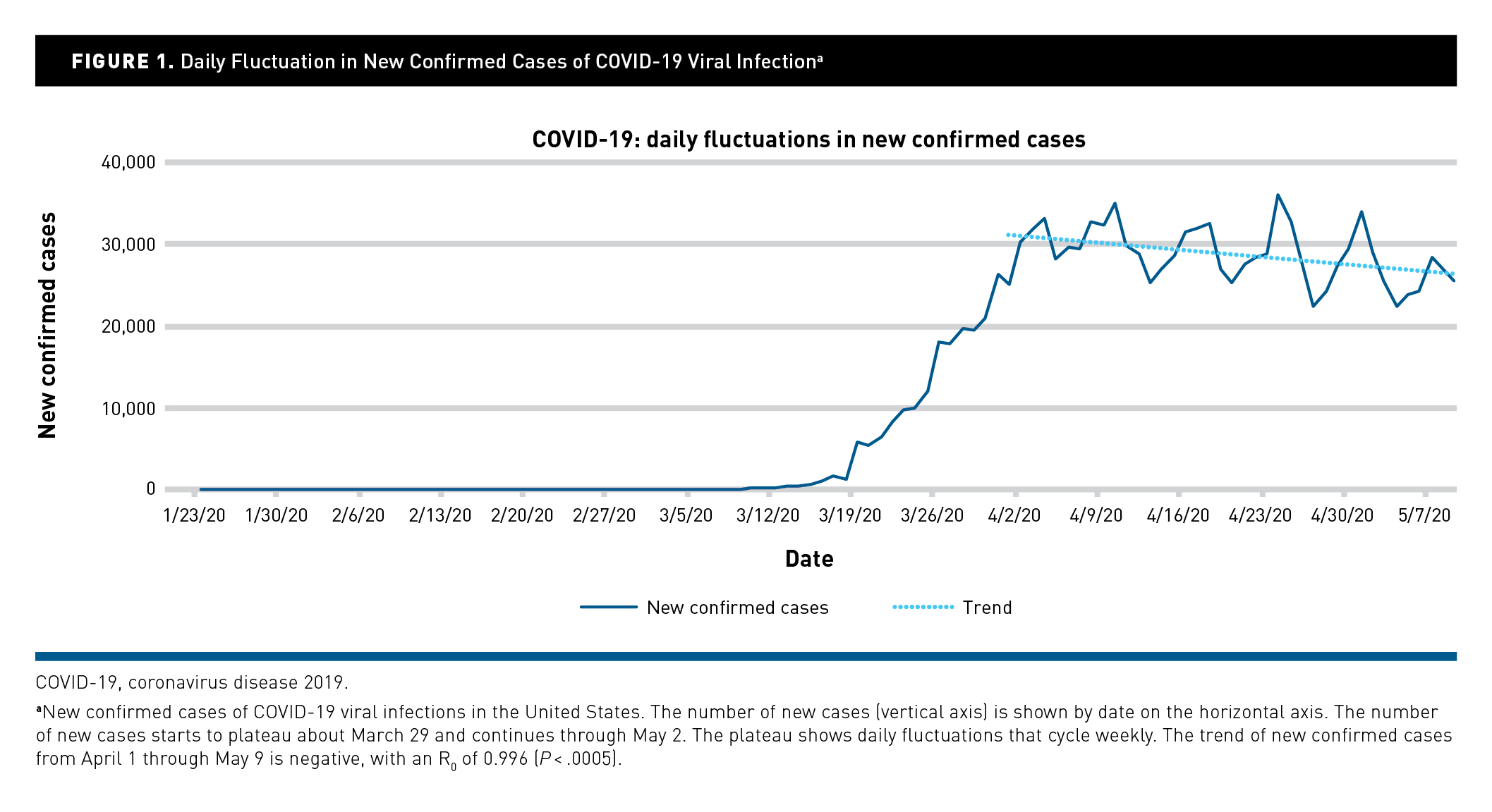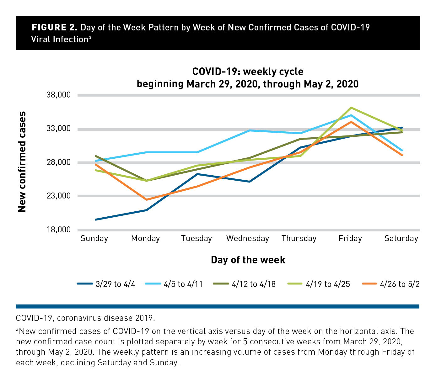 Examination of the daily fluctuations in new confirmed cases of coronavirus disease 2019 (COVID-19) in the United States, as reported by the Johns Hopkins University Coronavirus Resource Center through the user content section of GitHub, reveals a weekly cycle by day of the week.1 All days of available data were reviewed through May 11, 2020, considering only complete weeks, since the new case plateau began on March 29, 2020, through May 2, 2020.