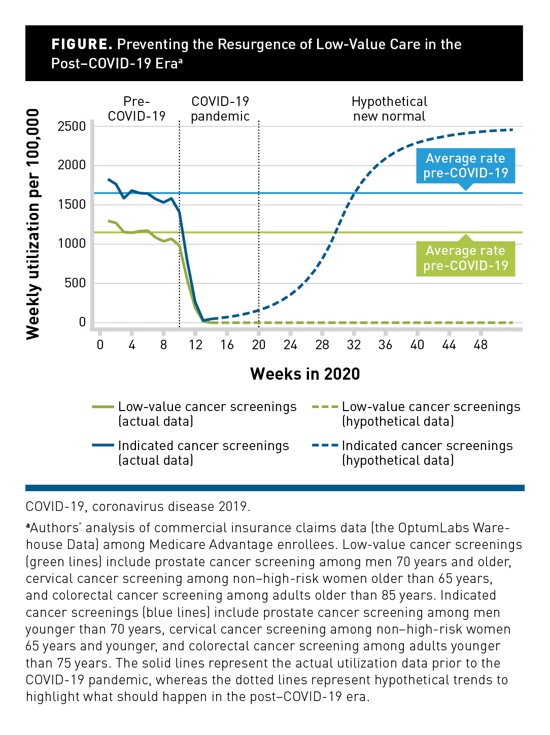 How the health care system will respond to the ongoing pandemic and its aftermath remains unclear. During March 2020, the frequency of all routine cancer screenings (and virtually all nonemergent care unrelated to COVID-19) nose-dived, regardless of clinical benefit.2,3 What is certain is that a large and rapid infusion of funds is necessary to support substantial unmet clinical demand and to restore the financial footing of clinicians and hospitals. A multipronged strategy that aligns provider-facing incentives (eg, payment) and consumer-facing incentives (eg, benefit design) is warranted to ensure that a greater proportion of health care spending is dedicated to high-value care that improves health and a lower proportion to low-value care that produces no or little clinical benefit.4,5