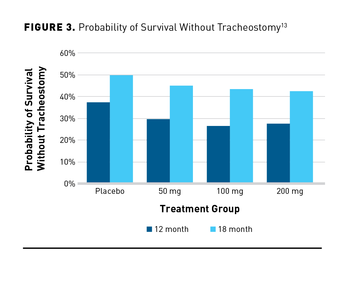 - Efficacy: prolongs median time to death or tracheostomy by 2 to 3 months7