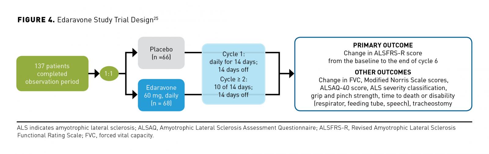 Edaravone is an antioxidant and free radical scavenger that was initially developed as an intravenous (IV) treatment of acute ischemic stroke.19 Despite mixed clinical results, it was approved by the FDA in May 2017.20
