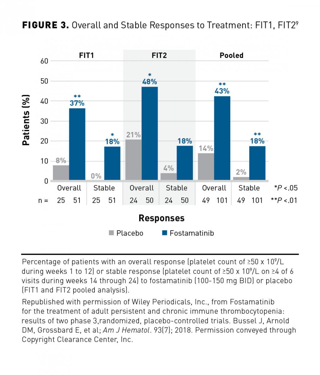The primary endpoint of stable response was stringently defined as a platelet count of ≥50 x 109/L on at least 4 of 6 visits during weeks 14 through 24. Overall response was defined as a platelet count of ≥50 x 109/L during weeks 1 to 12 and was a post hoc analysis. Combined results from the FIT1 and FIT2 studies showed a stable response rate of 18% with fostamatinib versus 2% with placebo (P = .0003; sensitivity analysis showed 17% versus 2%, P = .007), and an overall response rate of 43% with fostamatinib versus 14% with placebo (P = .0006) (