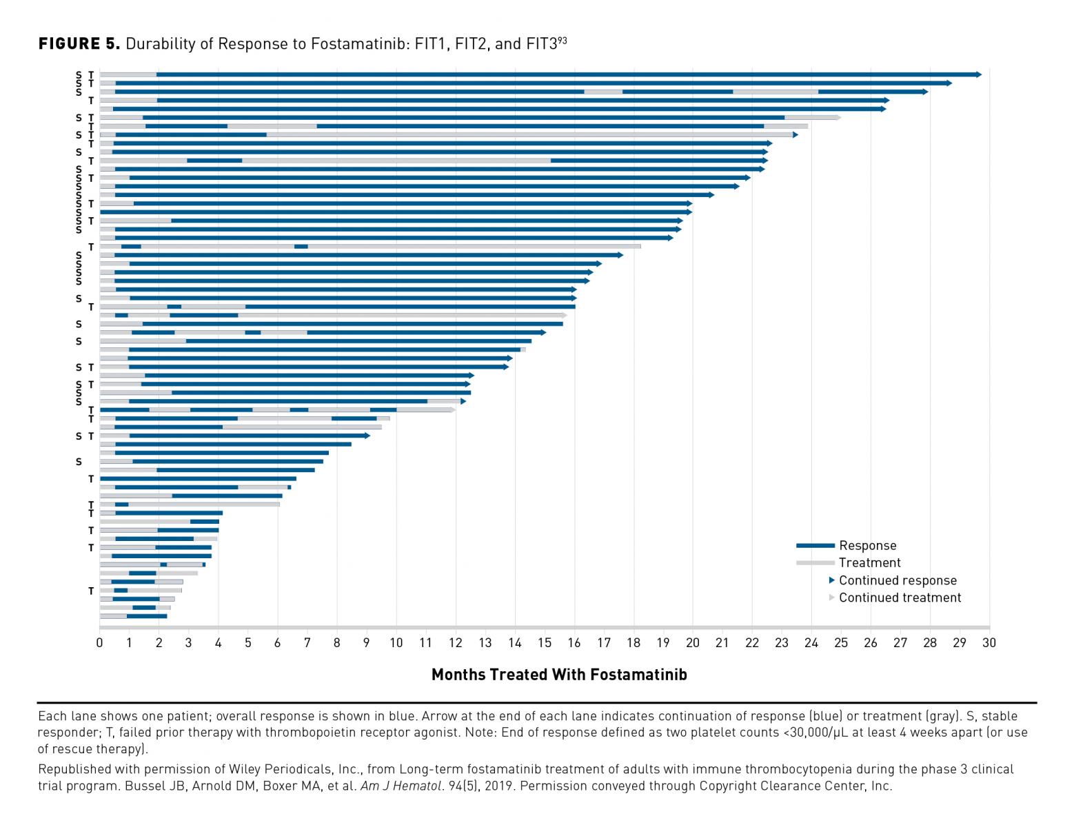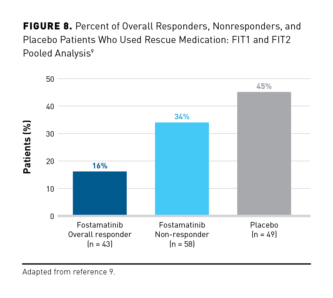 Across the phase 3 studies and the open-label extension (OLE) study, 146 patients were treated with fostamatinib, and 64 of 146 (44%) patients achieved an overall response, which included 43 of 101 (43%) patients from the fostamatinib arm and 21 of 44 (48%) patients who were transitioned to fostamatinib from the placebo arm of the phase 3 studies.93 The overall response to fostamatinib was maintained over the course of treatment; median platelet counts remained ≥50 x 109/L at all visits, with a median post-baseline platelet count of 63 x 109/L (