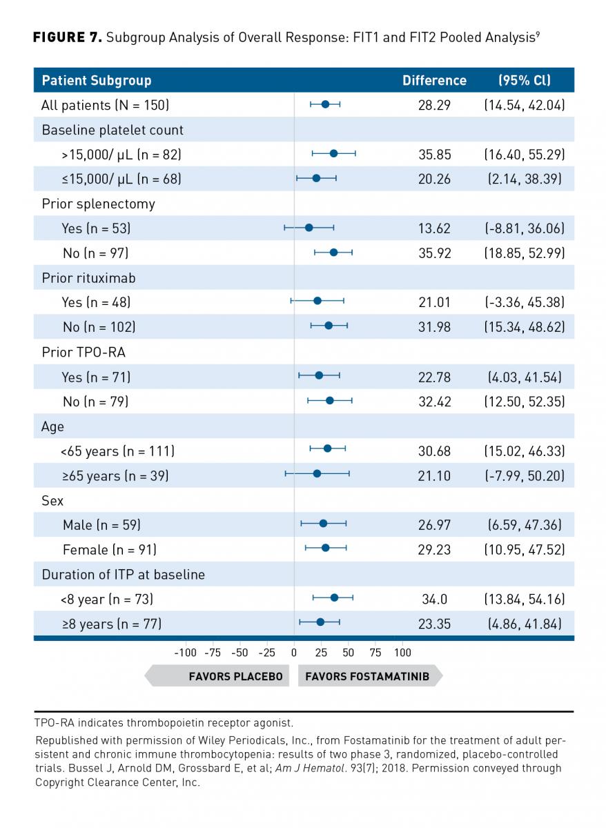 Responses to fostamatinib were observed among patients with long-standing ITP (average time from diagnosis of 8.5 years), who were heavily pre-treated (splenectomy, rituximab, and/or TPO-RAs) and are considered difficult to treat. Lower rates of response have been observed in studies of rituximab and other agents among heavily pretreated patients with a longer ITP duration compared with earlier stage patients.94,95 Fostamatinib was also effective in 75% of patients with persistent ITP (<12 months).93 Subgroup analyses illustrate overall responses across subgroups categorized by duration of ITP, prior TPO-RA therapy, prior splenectomy, and baseline platelet count (