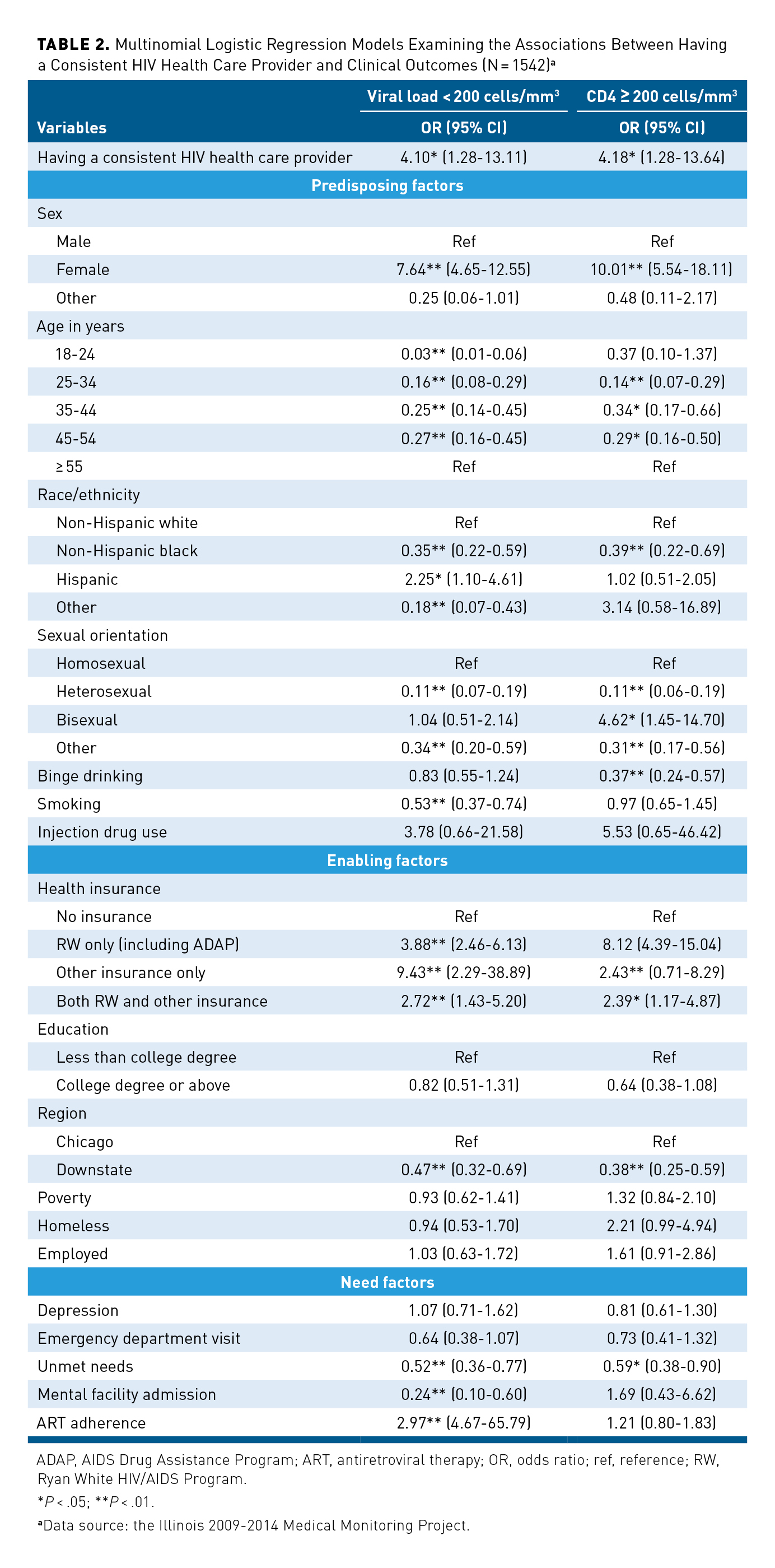 This study applied the Andersen model of health care utilization to guide variable selection. Andersen’s model consists of 3 major components—predisposing factors (eg, age, race/ethnicity), enabling factors (eg, health insurance, education, geography), and need factors (eg, self-perceived need for health services, actual physical and mental health status)—that, together, influence health care utilization. These 3 groups of variables were included in this study when examining the associations of having a consistent HIV health care provider with HIV clinical outcomes.