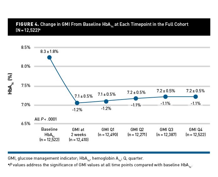 A significant reduction in GMI from baseline HbA1c levels was observed across the full cohort within the first 2 weeks of Contro1-IQ use and was sustained at each quarterly measurement throughout the 12-month observation period (P < .0001 at all increments) (