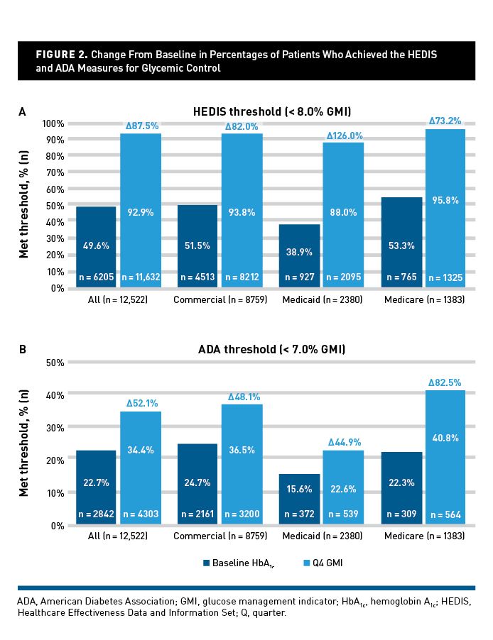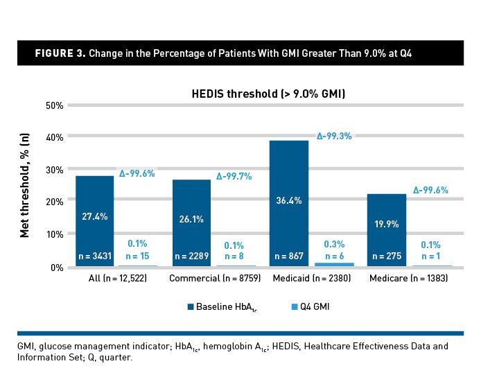 At baseline, 6205 (49.6%) individuals met the HEDIS quality standard for glycemic status (GMI < 8%) and 2842 (22.7%) individuals achieved a GMI less than 7%. By Q4, significant improvements were seen in the percentage of individuals meeting HEDIS or ADA quality standards. The percentage of patients meeting the HEDIS measure of GMI less than 8% increased to 92.9% (∆ = 87.5%) and the percentage achieving a GMI less than 7% increased to 34.4% (∆ = 51.4%).