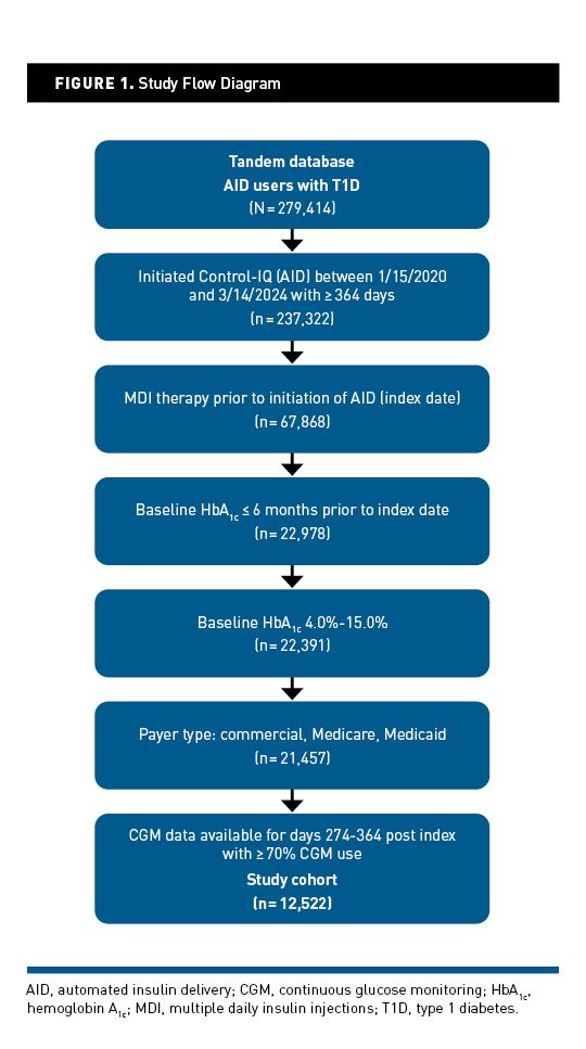 Methods: Inclusion criteria were having had prior treatment with MDI, having started Control-IQ at least 1 year prior to the study end date, having a most recent recorded baseline HbA1c measurement within 6 months prior to AID initiation, and having at least 70% continuous glucose monitoring use during the 12-month postinitiation period. The primary outcome was the change in number and proportion of individuals who met the HEDIS quality measure (HbA1c or GMI of < 8% [control] or > 9.0% [poor control]) and American Diabetes Association (ADA) glycemic target (< 7%) according to payer type (commercial, Medicaid, Medicare) during the 12-month observation.
