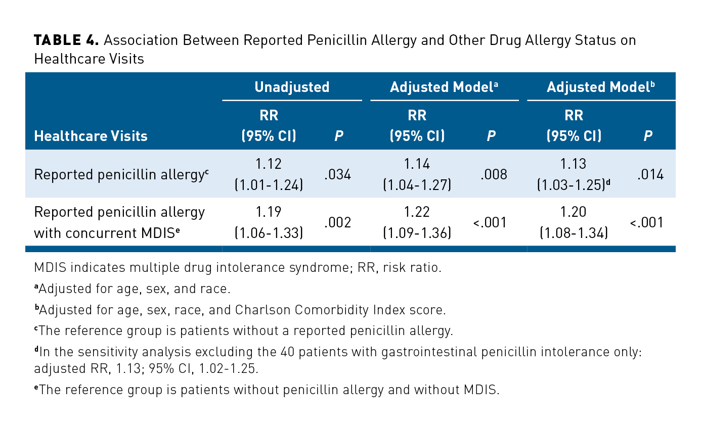 In the multivariable adjusted analysis, numbers of healthcare visits were significantly greater for patients with a reported penicillin allergy compared with those not reporting a penicillin allergy (RR, 1.13; 95% CI, 1.03-1.25) (