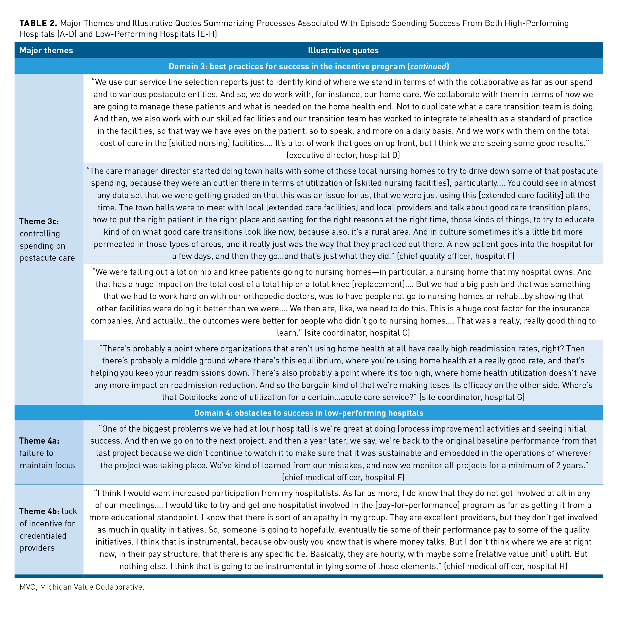 We investigated 4 overarching domains: (1) clinical condition selection approaches, (2) strategies for episode payment improvement, (3) practices for achieving maximum incentives, and (4) obstacles to success in low-performing hospitals. Representative quotations are presented below and in Table 2 [