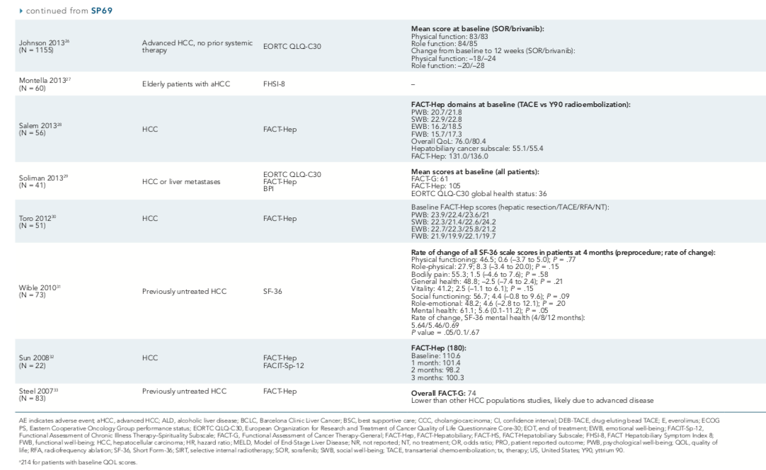 QOL. Twenty-four studies reported results related to PRO measures evaluating QoL and symptoms in patients with HCC7,9,12-33; US-only populations were included in 10 studies (Tables 2 and 3). A detailed summary of the data can be found in