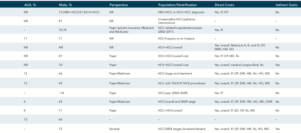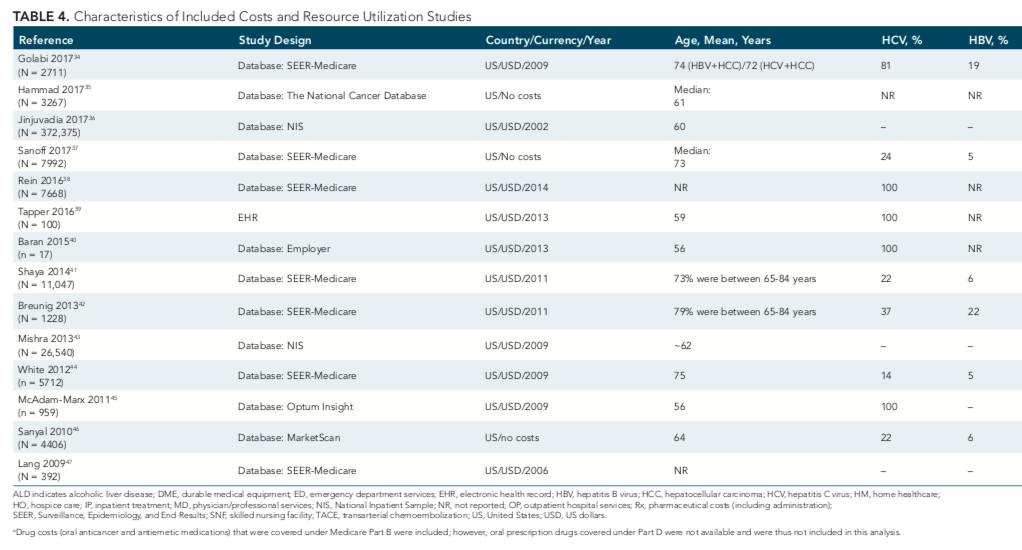 Direct Costs. Direct cost outcomes varied markedly across the studies (Table 5). For studies reporting overall direct costs for patients with HCC regardless of stage or treatment, per patient per year (PPPY) costs ranged from $29,35447 to $58,529,45 with median overall costs of up to $176,456 per patient.39