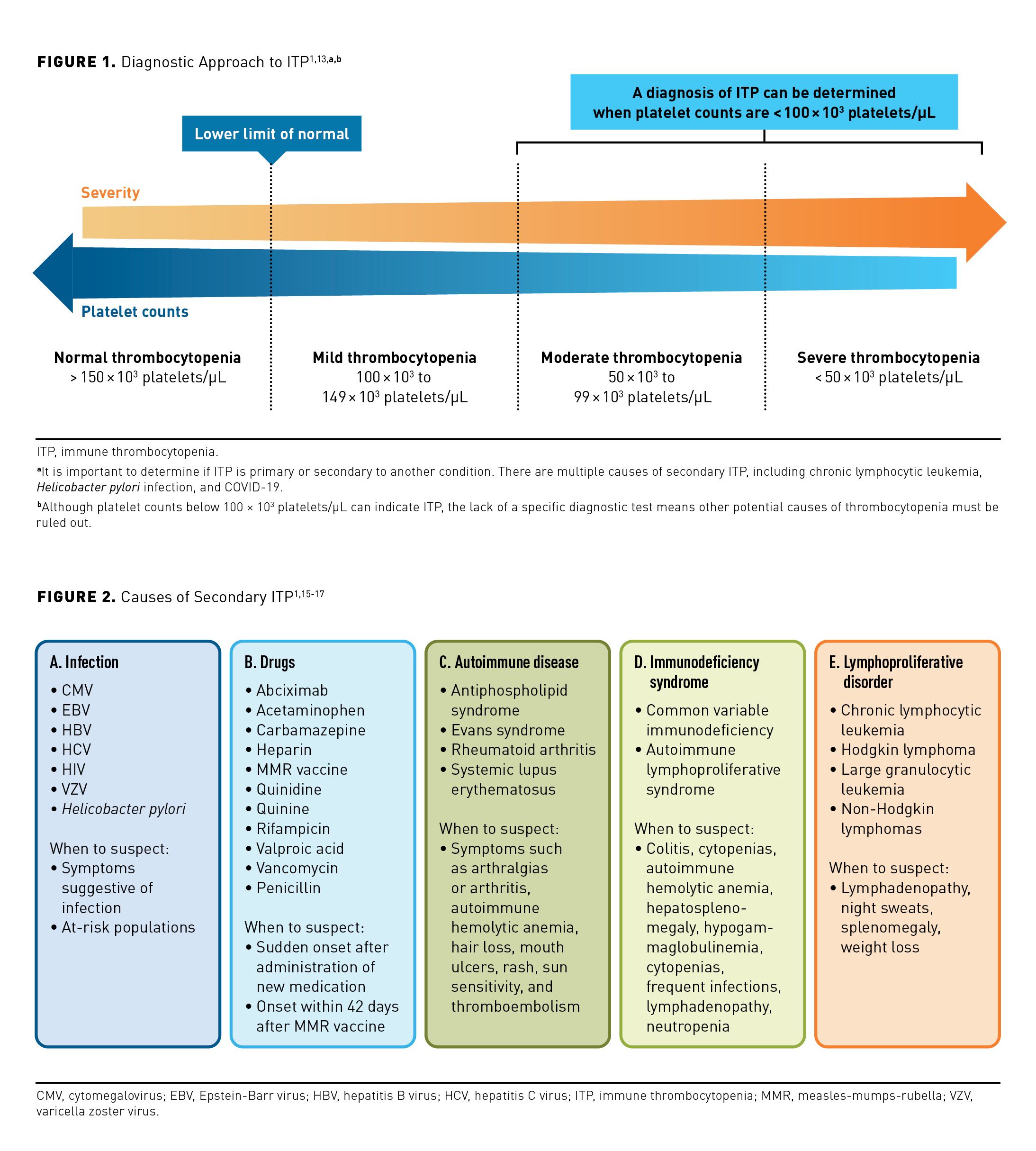 The incidence of ITP is estimated at 2 to 5 per 100,000 persons, with peaks in individuals between the ages of 20 and 30 years and again in those older than 60 years.1,2 There is no singular diagnostic test for ITP.1 It is typically a diagnosis of exclusion that is established when platelet counts fall below 100 × 103/μL and other potential causes of thrombocytopenia have been ruled out through additional testing, physical examination, and patient history (