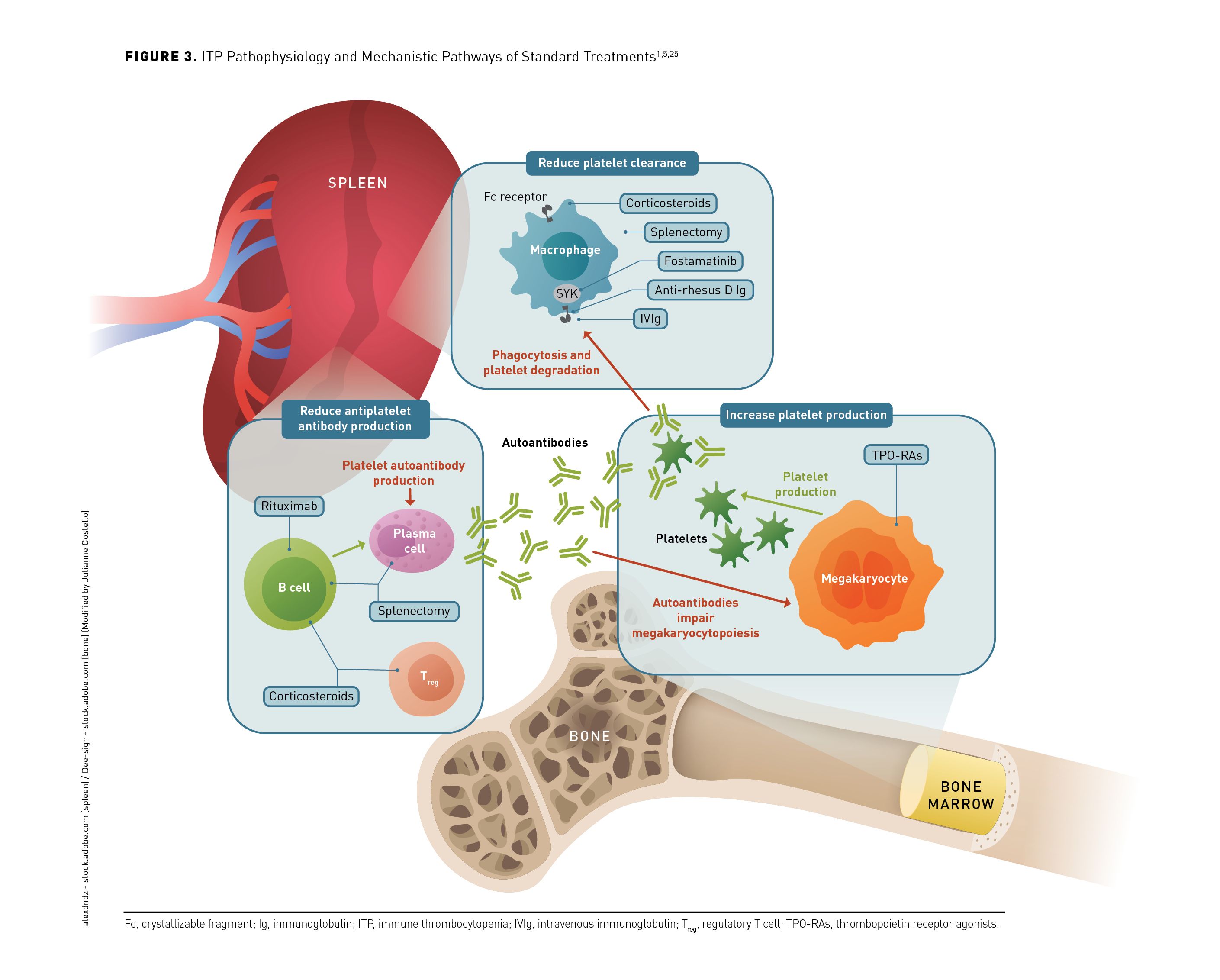 The current goal of ITP treatment is to stop active bleeding and prevent future bleeding.1 The treatment of ITP follows 3 main mechanistic pathways: reducing antiplatelet antibody production, inhibiting platelet clearance, and increasing platelet production (