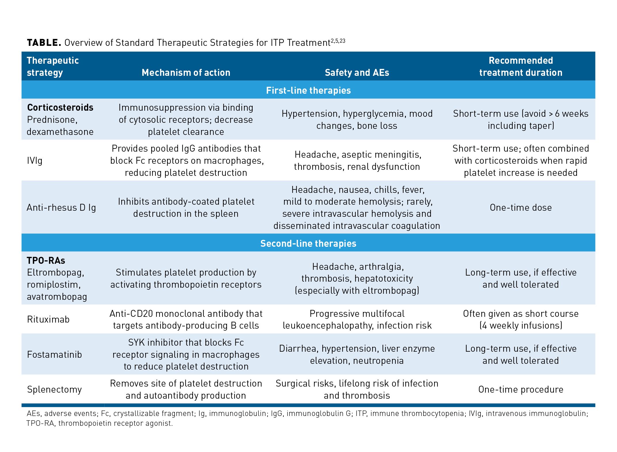 The decision to observe or initiate pharmacological treatment in newly diagnosed ITP depends on the severity of thrombocytopenia, patient comorbidities, concurrent medications, and age, all of which influence bleeding risk. Additional factors such as disease duration, health care access, QOL considerations, and patient and provider preferences also play a role in management. According to the 2019 guidelines from the American Society of Hematology (ASH), patients with a platelet count of at least 30 × 103/μL who are asymptomatic or have only minor mucocutaneous bleeding can be managed with observation, whereas those with a platelet count below 30 × 103/μL typically require treatment with a short course (≤ 6 weeks) of corticosteroids as first-line therapy. Prednisone or dexamethasone may be used, with dexamethasone offering a faster platelet response. Treatment with corticosteroids alone is recommended over combination therapy with rituximab unless long-term remission is prioritized over concerns related to rituximab-associated AEs. Close monitoring is essential to assess corticosteroid-related AEs (eg, hypertension, hyperglycemia, sleep and mood disturbances, osteoporosis) and overall HRQOL. For persistent ITP (≥ 3 months since diagnosis) in corticosteroid-dependent or unresponsive patients, ASH recommends TPO-RAs, rituximab, or splenectomy as second-line options. TPO-RAs and rituximab are recommended interventions for patients who wish to avoid surgery. Splenectomy may be considered for patients who place high importance on achieving a durable response and should generally be delayed for at least 1 year due to the possibility of spontaneous remission.2
