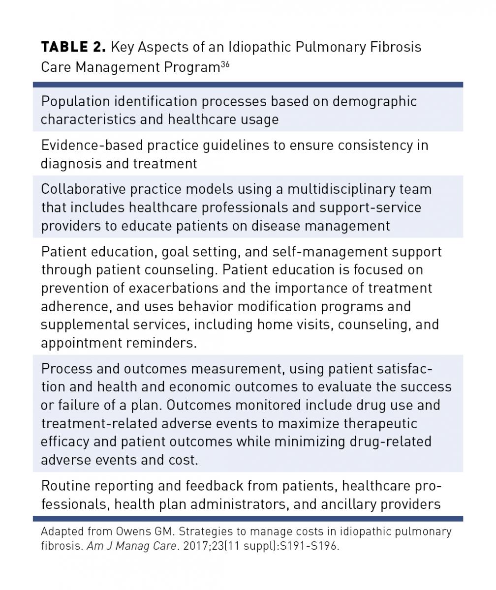 Patients with IPF can experience multiple comorbidities, low survival rates, loss of quality of life, and substantial medical costs. However, the antifibrotic drugs nintedanib and pirfenidone may offer hope in mitigating the progression of this debilitating disease. Multidisciplinary healthcare approaches that focus on early diagnosis and assertive treatment of IPF, before disease progression, may help improve health outcomes while managing costs. Care management programs can be important components of such approaches, particularly for monitoring and treating comorbidities. Pharmacists can be integral to effective disease management for patients with IPF by being involved in medication therapy management, monitoring and avoiding drug—drug interactions, improving medication adherence, and assisting with approaches to mitigate the financial burden of drug therapies. Disease registries may be underused resources that can be beneficial in developing best practices by serving as useful resources for the storage of large datasets for subsequent analyses.Author affiliation: Consultant, Birmingham, AL.