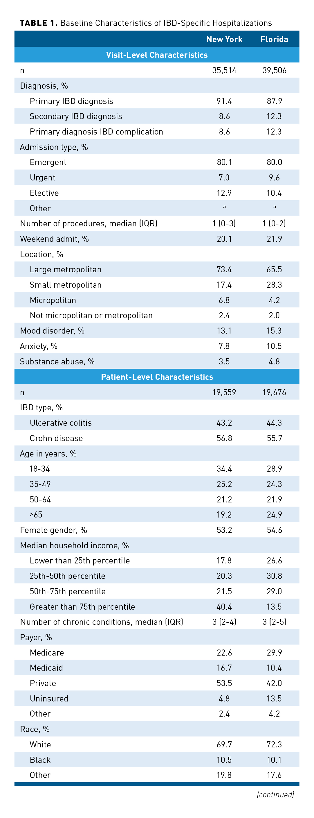 In the New York and Florida cohorts, 43.2% and 44.3% had ulcerative colitis, respectively, and 56.8% and 55.7% had Crohn disease. In New York and Florida, 53.2% and 54.6% were female, respectively. The baseline patient- and visit-level characteristics for both New York and Florida are shown in Table 1 [