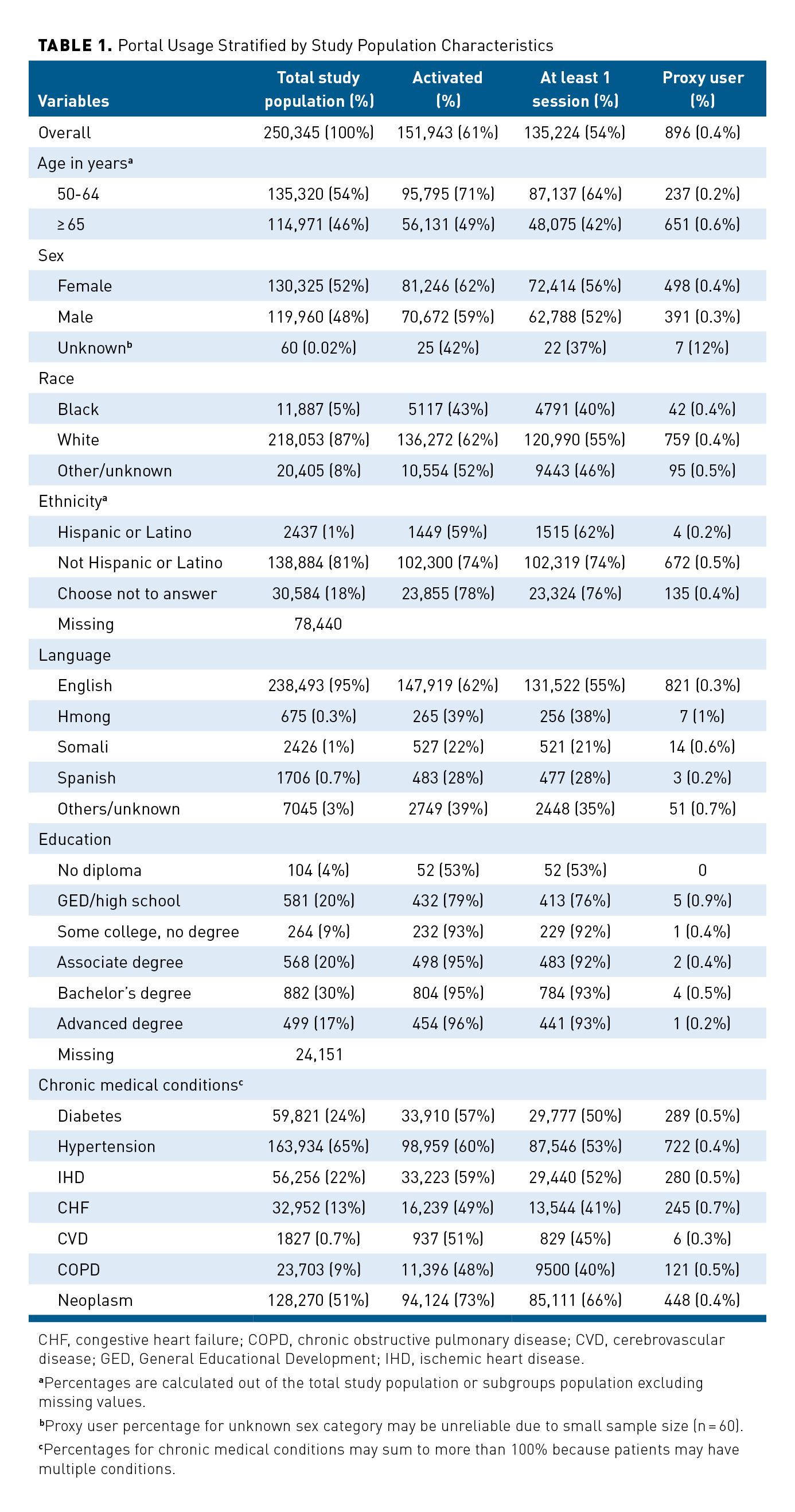 - Among 250,345 adults included in the analysis, 61% activated their MyChart account and 54% logged at least 1 session.