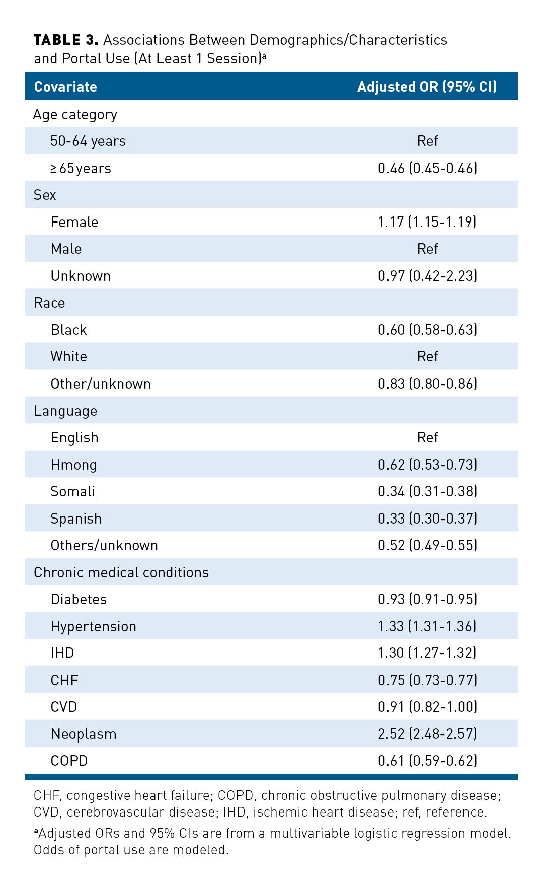 - Patients with diabetes, neoplasms, hypertension, and ischemic heart disease had higher odds of portal use, and those with heart failure or chronic obstructive pulmonary disease had lower engagement.