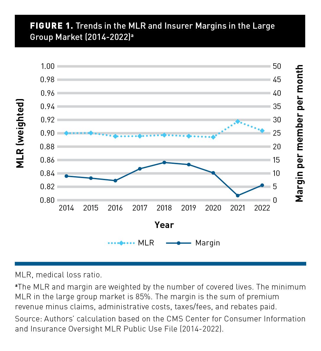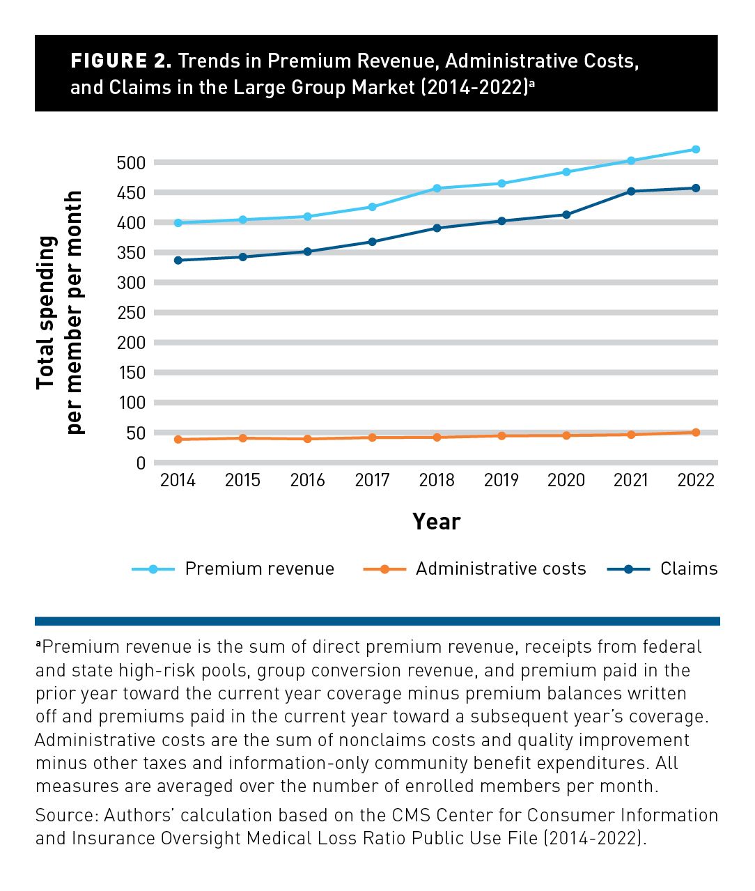 In this study, we focused on the large group market where insurers sell plans to large groups (ie, > 50 employees). We contribute to the existing literature by leveraging underutilized data on insurer financial filings and a longer time series that allows us to include data on post–COVID-19 pandemic trends. We aimed to decompose what may be driving observed increases in health insurance premiums over time in the large group market (2014-2022) by understanding the growth in individual inputs to the MLR, including spending on medical claims, administrative costs, and quality improvement, and by assessing insurer margins.