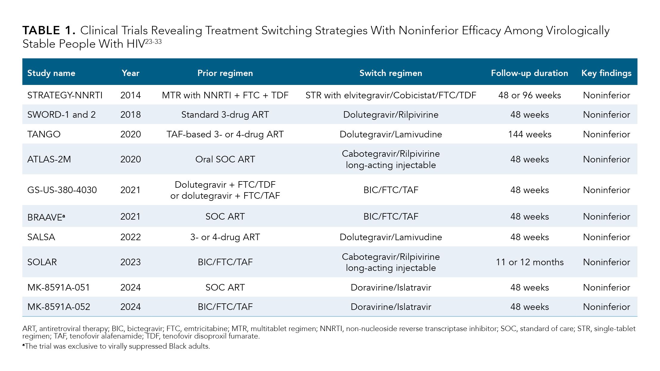 Current HIV treatment guidelines offer recommendations to treat stable, virologically suppressed PWH who have recently switched their HIV treatment regimen. Whereas treatment-naïve PWH can generally begin HIV care on any approved ART, treatment switching for virologically suppressed PWH requires consideration of prior treatment failures. Moreover, following any change to HIV treatment, patients must be monitored for 3 months to ensure patient understanding and adherence, monitor any new treatment-emergent AEs, assess regimen tolerance, and guide targeted laboratory testing and medical resource usage (particularly if comorbidities precipitated the treatment switch).8