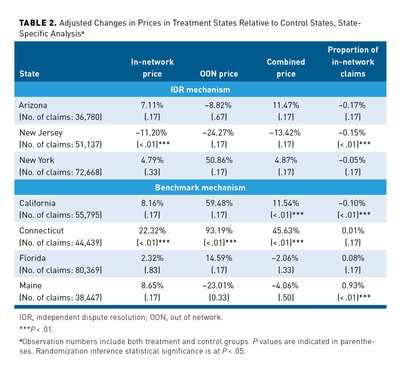Results: For both independent dispute resolution (IDR) and benchmark rating approaches, the event studies did not show changes in in-network prices or combined prices, compared with control states, but they showed out-of-network price increases in states with the IDR approach. State-specific analyses indicated mixed results for both IDR and benchmark rating approaches.