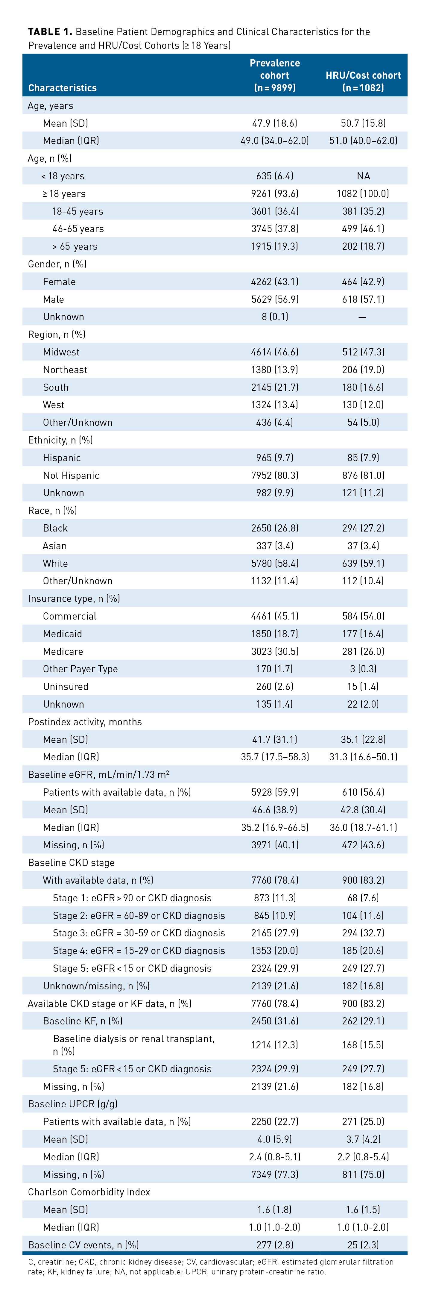 A total of 1082 adult patients (≥ 18 years of age), met the criteria for the HRU/cost analysis with mean (SD) age of 50.7 (15.8); 57.1% of the patients were male, 59.1% were White, and 27.2% were Black. Median (IQR) baseline eGFR was 36.0 (18.7-61.1) mL/min/1.73 m2. In total, 728 patients (67.3%) were at CKD stages 3 to 5, and the median (IQR) baseline UPCR was 2.2 (0.8-5.4) g/g.
