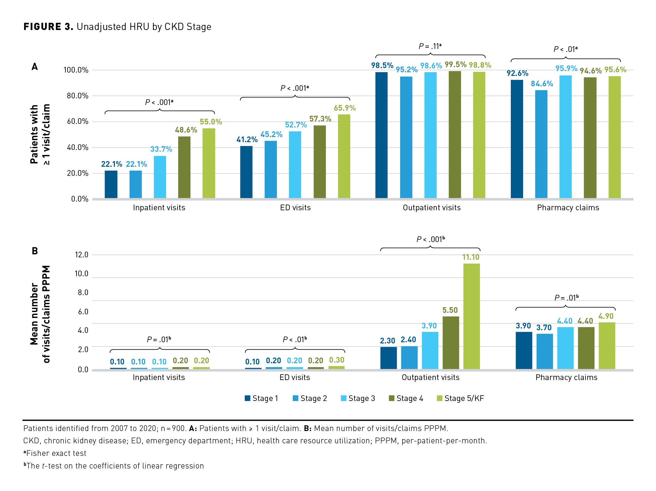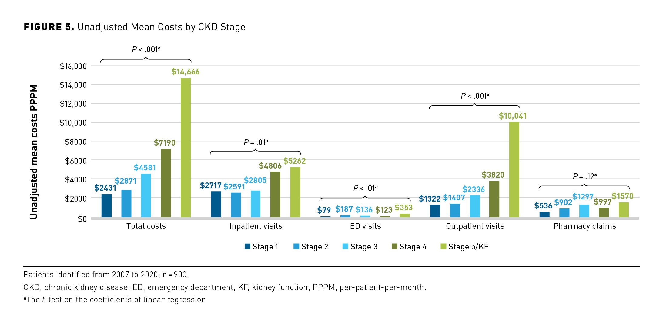 Like utilization, there was a consistent trend for costs to increase as baseline disease severity increased. PPPM total costs were significantly higher at higher baseline CKD stage, increasing from $2431 at stage 1 to $14,666 at stage 5 (P < .001) (