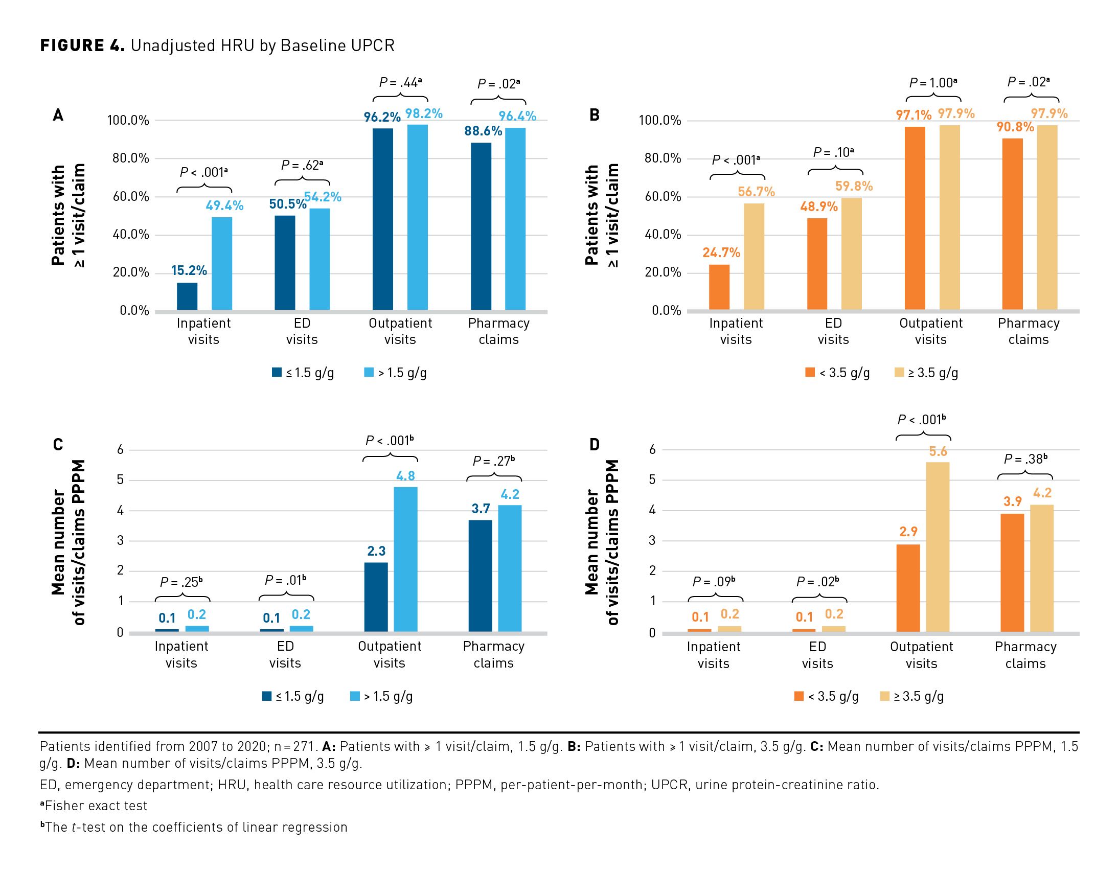 A trend for higher mean PPPM number of visits/claims was observed consistently across all HRU categories, reaching significance for ED visits (0.2 vs 0.1; P = .01) and outpatient visits (4.8 vs 2.3; P < .001) when comparing baseline proteinuria of up to 1.5 g/g vs more than 1.5 g/g (