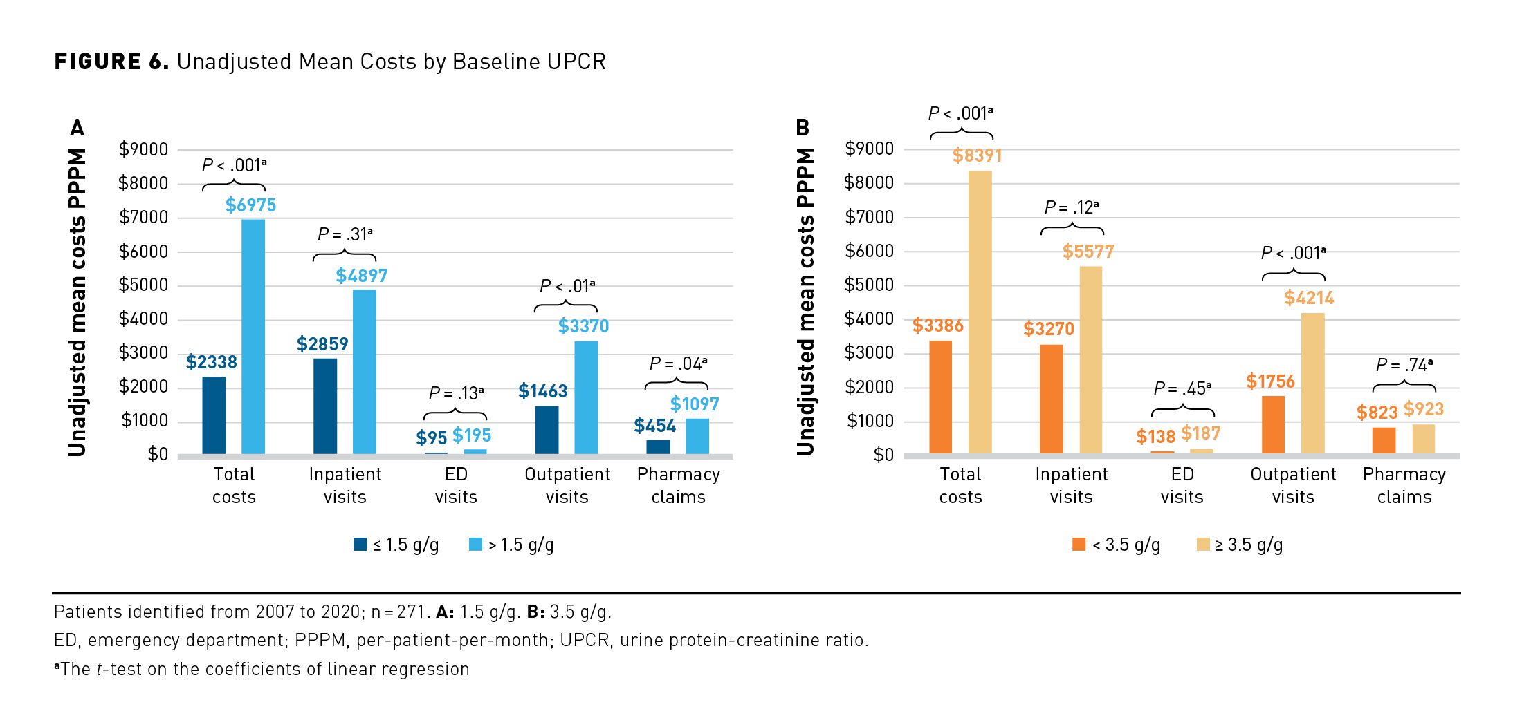 We also assessed the impact of proteinuria on costs and HRU using 2 clinically meaningful proteinuria thresholds: 1.5 g/g and 3.5 g/g.5,16 At both thresholds, higher levels of proteinuria were associated with significantly higher costs and HRU. For the UPCR threshold of at least 3.5 g/g, the mean total costs PPPM were approximately 40% higher than for those patients with a UPCR of less than 3.5 g/g and about 33% higher for patients with a UPCR of more than 1.5 g/g vs up to 1.5 g/g. This finding is supported by the results reported in the study by Kalantar-Zadeh et al,10 which demonstrated that the nephrotic range proteinuria, defined as a UPCR of above 3000mg/g or albumin/creatinine ratio of above 2000mg/g, was associated with higher costs ($70,481 vs $36,099 per-patient-per year [PPPY]; P < .001).