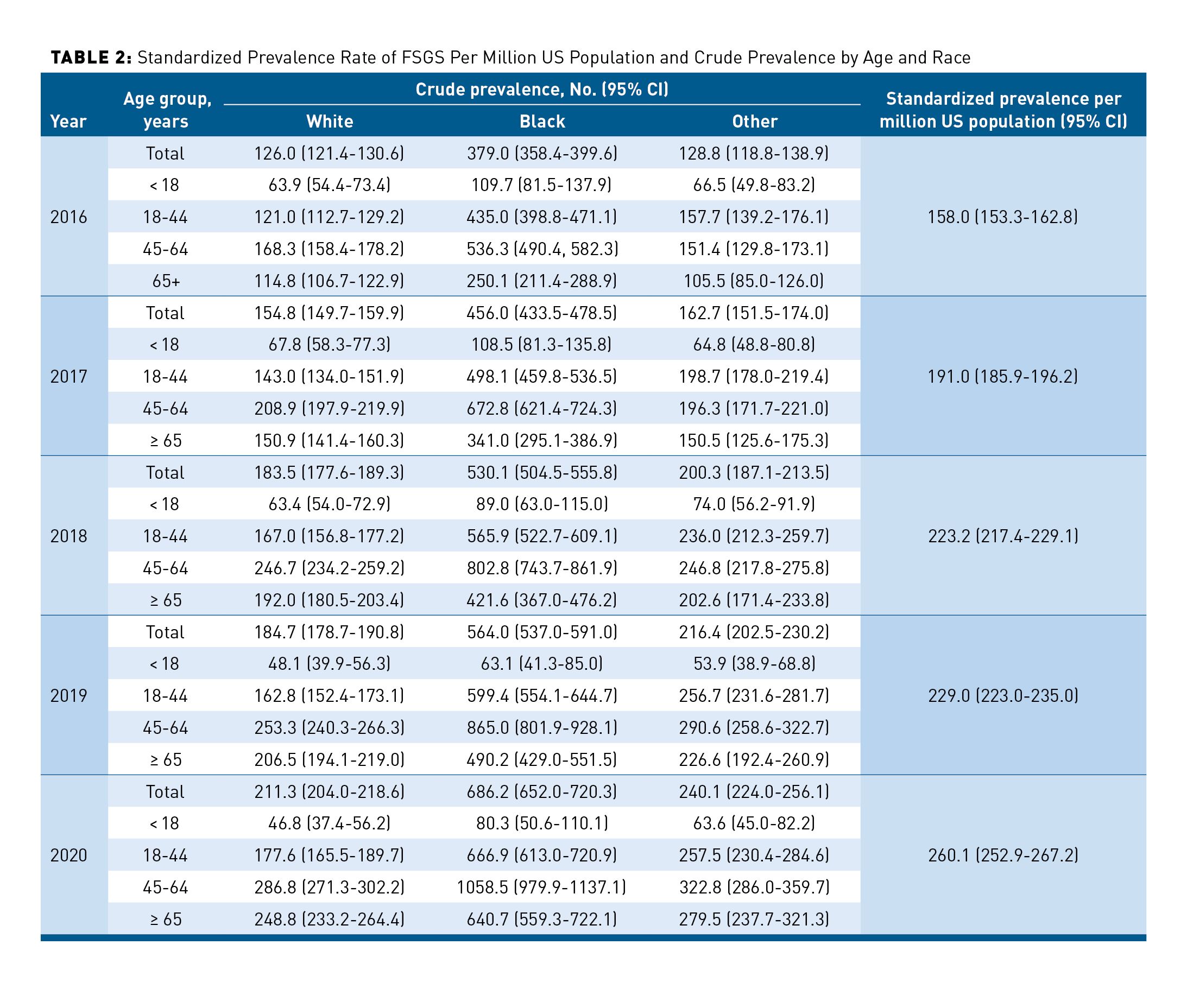 Conclusions: The observed prevalence of FSGS increased in the US and was highest among Black individuals. More advanced chronic kidney disease and higher levels of proteinuria were both associated with greater health care resource utilization and costs. Treatments that reduce proteinuria and slow kidney function decline have the potential to delay disease progression and to reduce the economic burden associated with FSGS.