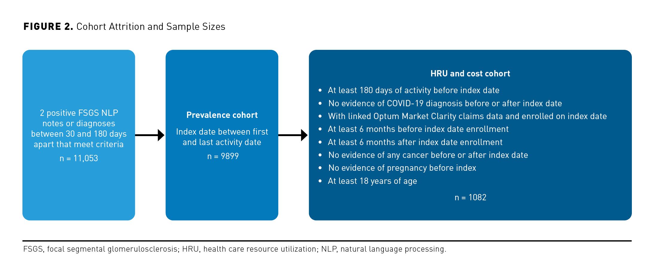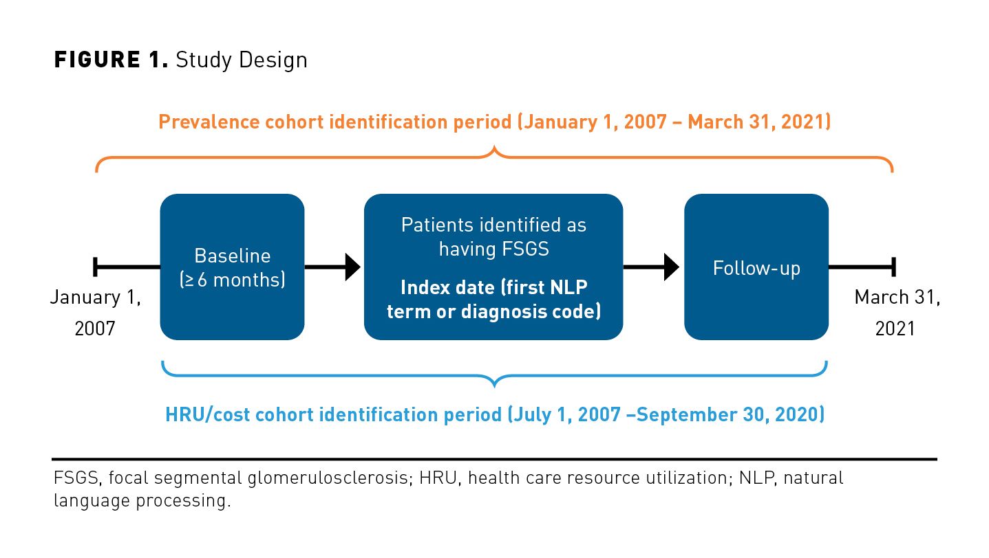 The study and identification period for the prevalence cohort were from January 1, 2007, through March 31, 2021. Patients in the HRU/cost cohort were identified from July 1, 2007, through September 30, 2020, to allow for a 6-month baseline and follow-up period. The index date was the first FSGS International Classification of Diseases, Tenth Revision (ICD-10) diagnosis code or NLP term within the identification period. During the pre-ICD-10 timeframe (prior to 2015), patients were identified using NLP terms, due to the limited granularity of the ICD-9 diagnosis code (582.1; chronic glomerulonephritis with lesion of membranous glomerulonephritis) for FSGS.