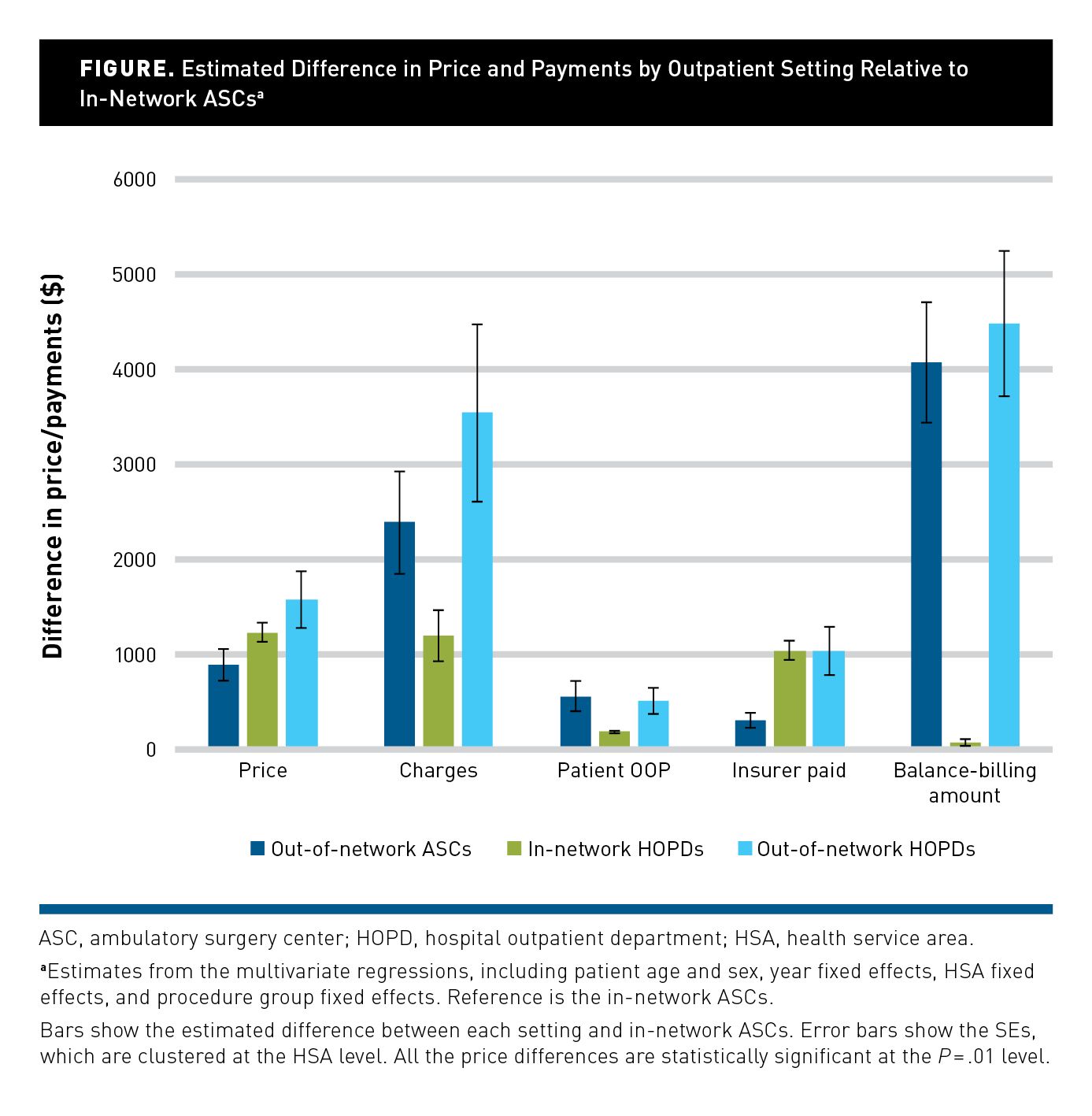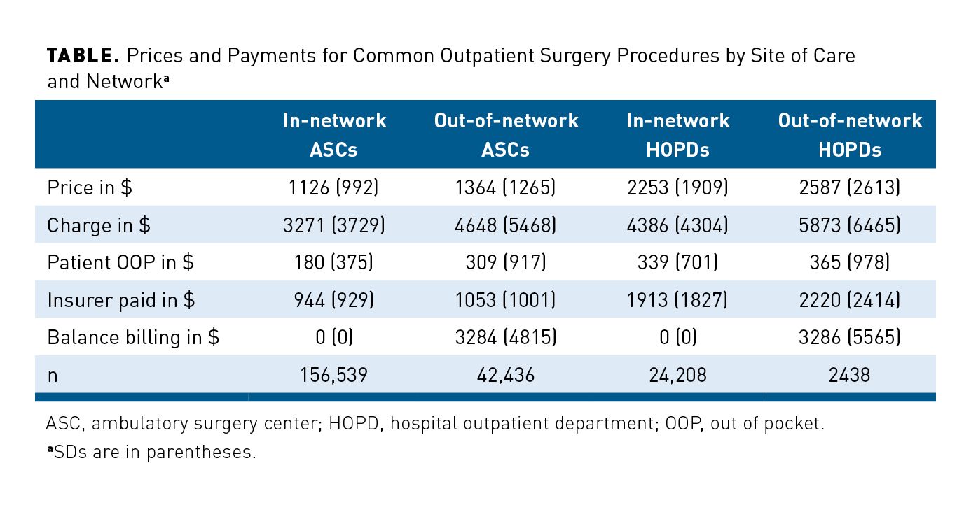 Results: Compared with a surgery occurring at an in-network ASC, insurers paid $306 (32%) more to an out-of-network ASC, $1042 (110%) more to an in-network HOPD, and $1041 (110%) more to an out-of-network HOPD. Patients paid $186 more out of pocket at an in-network HOPD than at an in-network ASC, which both had cost-sharing rates lower than out-of-network facilities.
